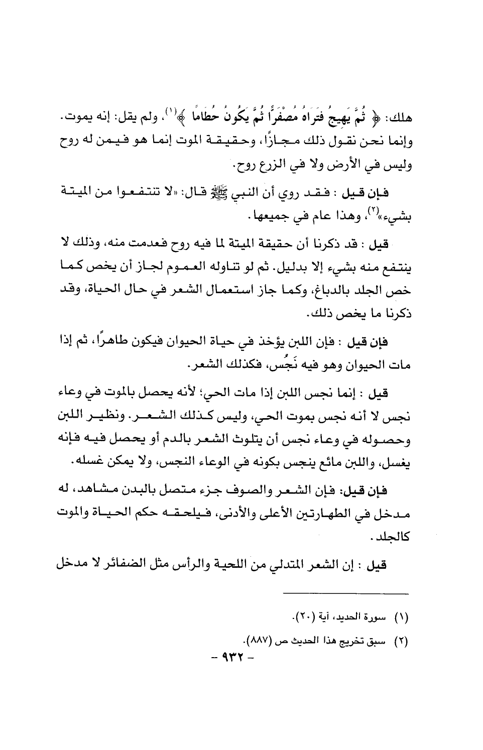 فإن قيل: فإن الشعر والصوف جزء متصل بالبدن مشاهد، له مدخل في الطهارتين الأعلى والأدنى، فيلحقه حكم الحياة والموت كالجلد.
