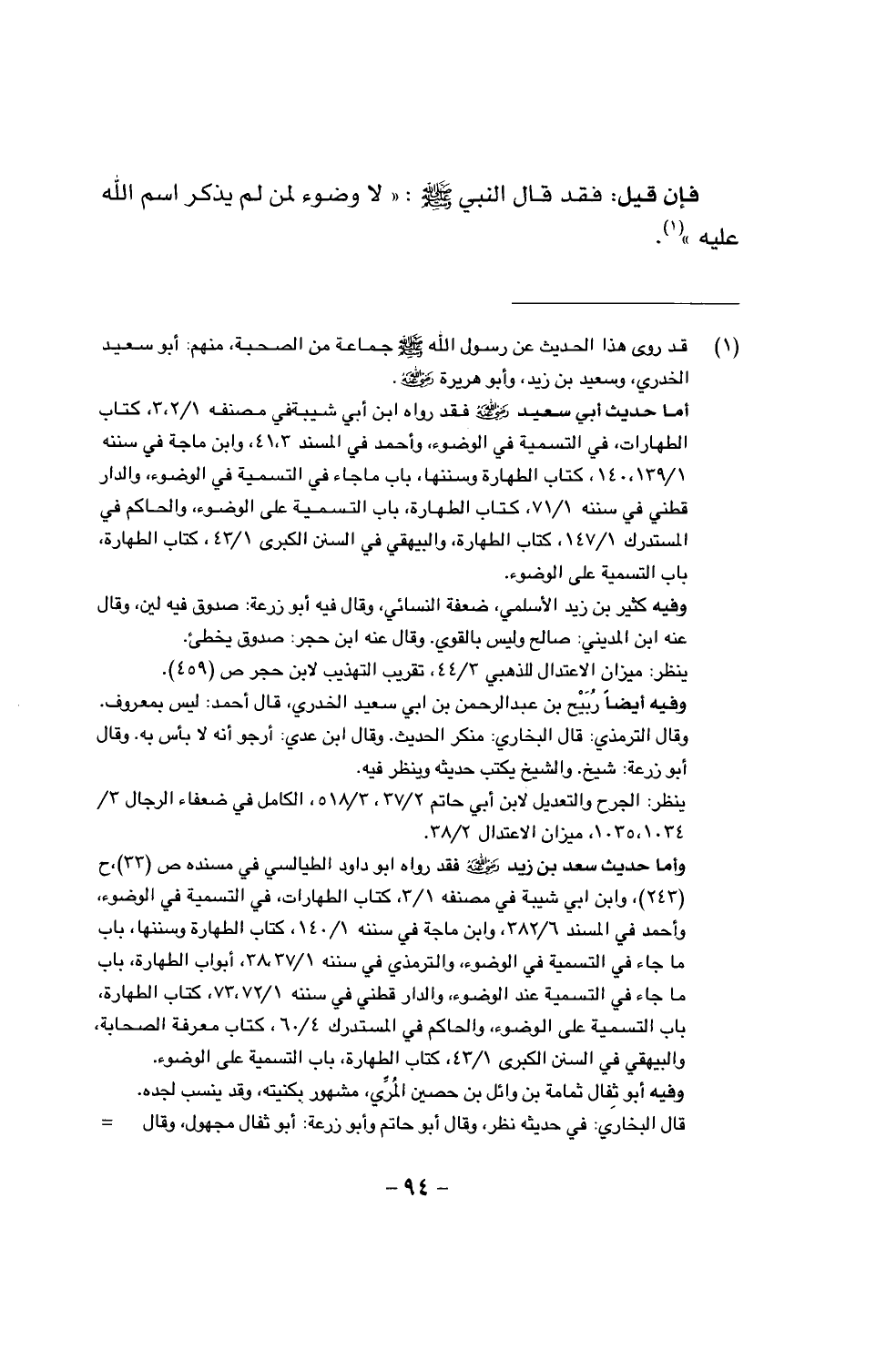 فإن قيل: فقد قال النبي صَلَّى اللَّهُ عَلَيْهِ وَسَلَّمَ «لا وضوء لمن لم يذكر اسم الله عليه».