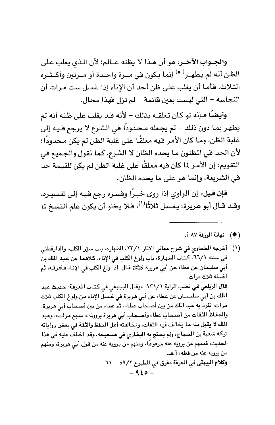 وأيضا فإنه لو كان تعلقه بذلك - لأنه قد يغلب على ظنه أنه لم يطهر بما دون ذلك - لم يجعله محدودا في الشرع لا يرجع فيه إلى غلبة الظن، وما كان الأمر فيه معلقا على غلبة الظن لم يكن محدودا؛ لأن الحد في المظنون ما يحده الظان لا الشرع، كما نقول والجميع في التقويم: إن الأمر لما كان فيه معلقا على غلبة الظن لم يكن للقيمة حد في الشريعة، وإنما هو على ما يحده الظان.