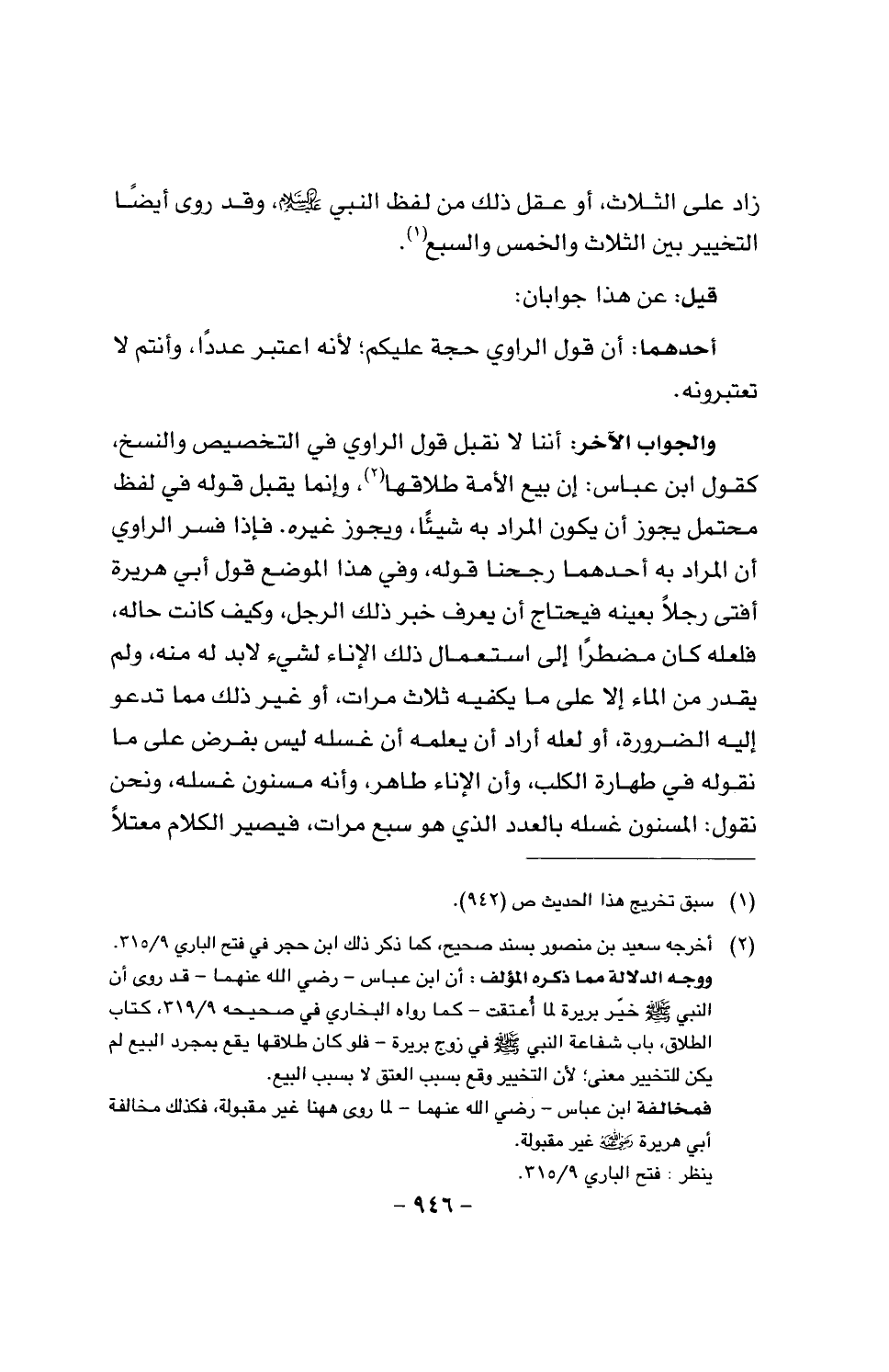والجواب الآخر: أننا لا نقبل قول الراوي في التخصيص والنسخ، كقول ابن عباس: إن بيع الأمة طلاقها، وإنما يقبل قوله في لفظ محتمل يجوز أن يكون المراد به شيئا، ويجوز غيره. فإذا فسر الراوي أن المراد به أحدهما رجحنا قوله، وفي هذا الموضع قول أبي هريرة أفتى رجلا بعينه فيحتاج أن يعرف خبر ذلك الرجل، وكيف كانت حاله، فلعله كان مضطرا إلى استعمال ذلك الإناء لشيء لابد منه، ولم يقدر من الماء إلا على ما يكفيه ثلاث مرات، أو غير ذلك مما تدعو إليه الضرورة، أو لعله أراد أن يعلمه أن غسله ليس بفرض على ما نقوله في طهارة الكلب، وأن الإناء طاهر، وأنه مسنون غسله، ونحن نقول: المسنون غسله بالعدد الذي هو سبع مرات، فيصير الكلام معتلا