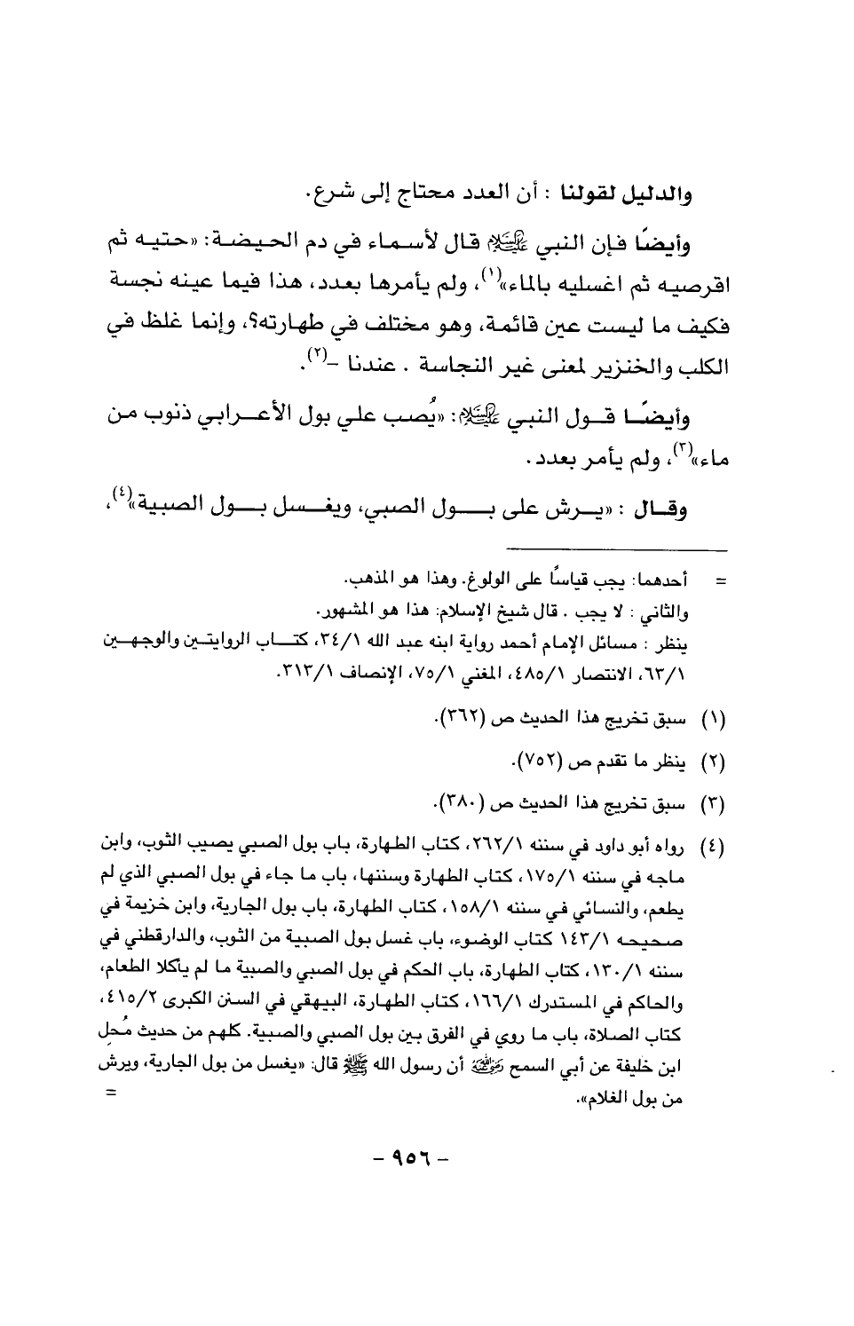 وأيضا فإن النبي عليه السلام قال لأسماء في دم الحيضة: (حتيه ثم اقرصيه ثم اغسليه بالماء)، ولم يأمرها بعدد، هذا فيما عينه نجسه فكيف ما ليست عين قائمة، وهو مختلف في طهارته؟، وإنما غلظ في الكلب والخنزير لمعنى غير النجاسة. - عندنا -.