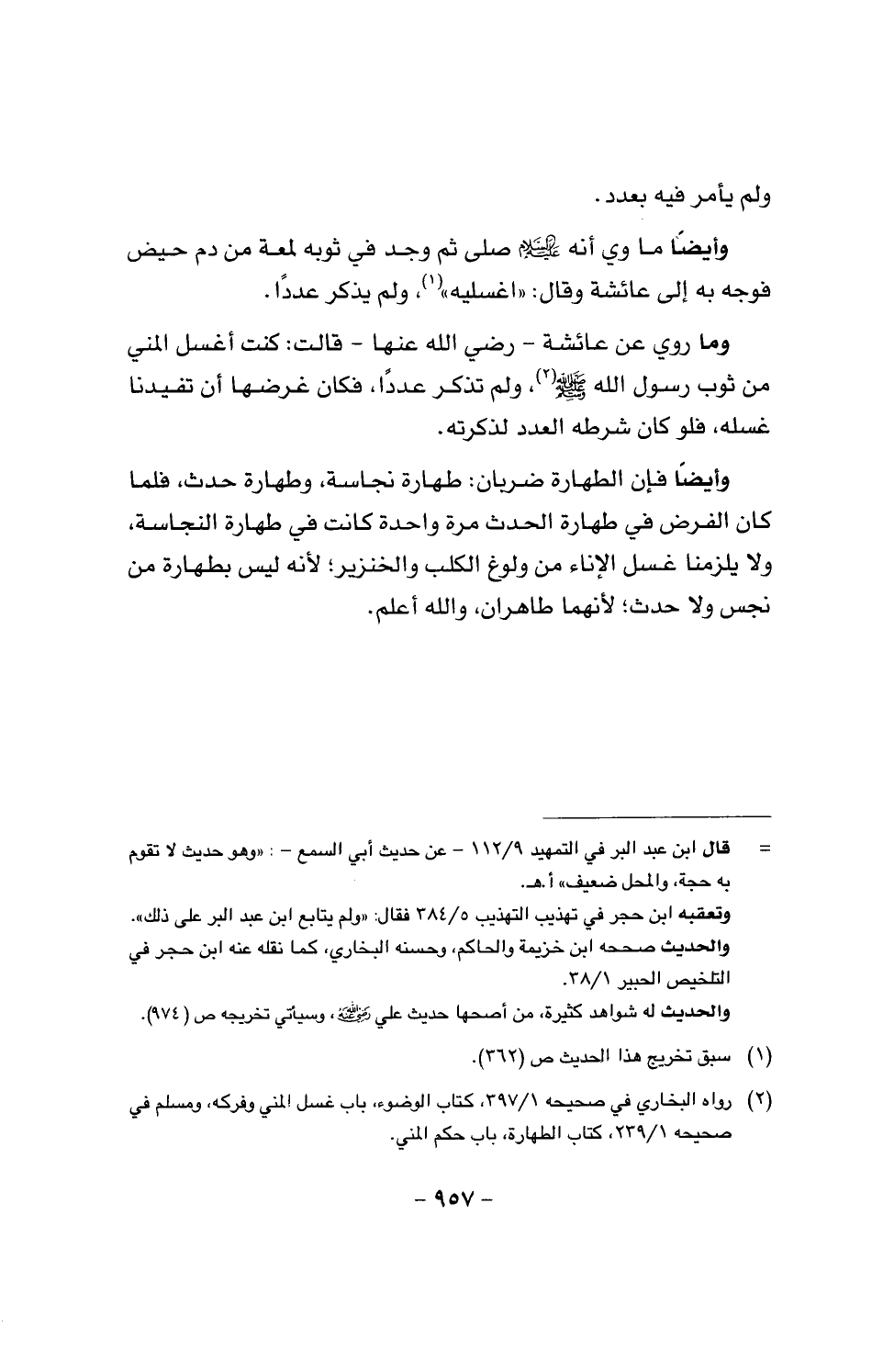 وما روي عن عائشة - رضي الله عنها - قالت: كنت أغسل المني من ثوب رسول الله صَلَّى اللَّهُ عَلَيْهِ وَسَلَّمَ، ولم تذكر عددا، فكان غرضها أن تفيدنا غسله، فلو كان شرطه العدد لذكرته.