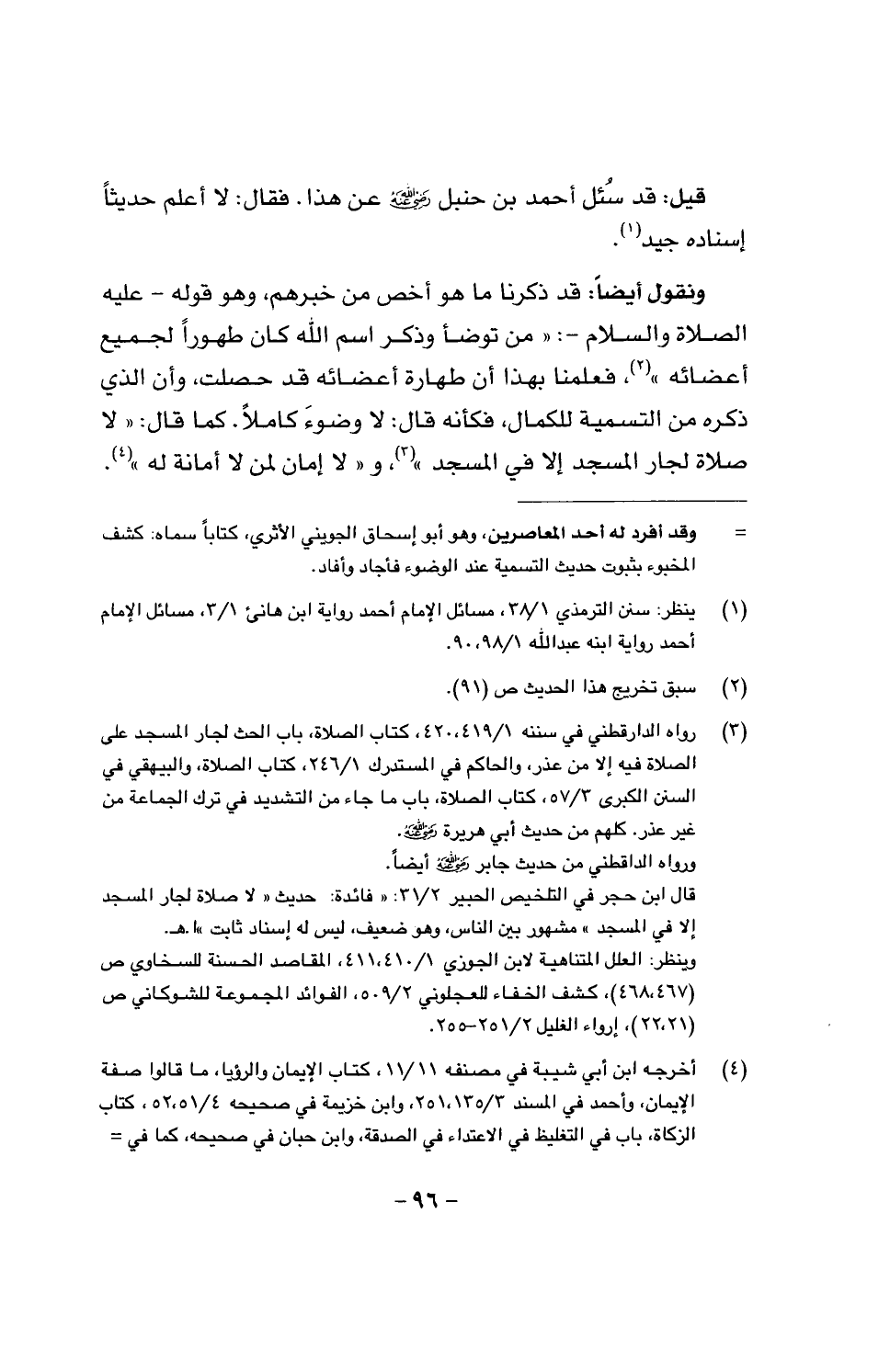 ونقول أيضاً: فقد ذكرنا ما هو أخص من خبرهم، وهو قوله -عليه الصلاة والسلام -: - «من توضأ وذكر اسم الله كان طهوراً لجميع أعضائه»، فعلمنا بهذا أن طهارة أعضائه قد حصلت، وأن الذي ذكره من التسمية للكمال، فكأنَّه قال: لا وضوء كاملاً، كما قال: لا صلاة لجار المسجد إلا ي المسجد»، و «لا إمان لمن لا أمانة له».