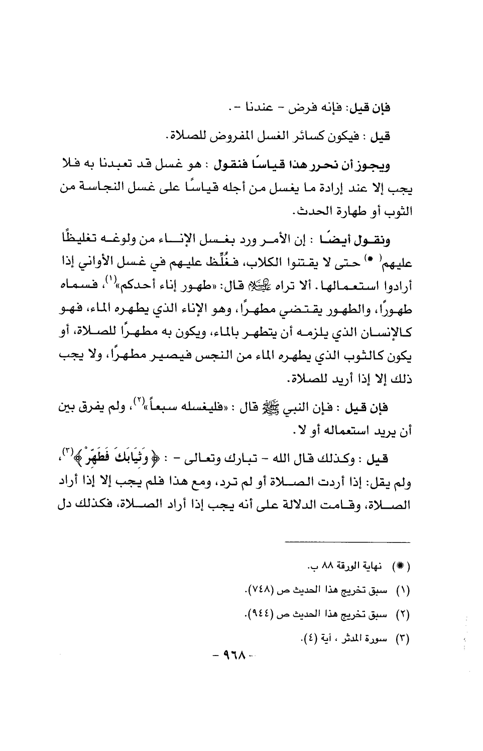 قيل: وكذلك قال الله - تبارك وتعالى -: {وثيابك فطهر}، ولم يقل: إذا أردت الصلاة أو لم ترد، ومع هذا فلم يجب إلا إذا أرد الصلاة، فكذلك دل