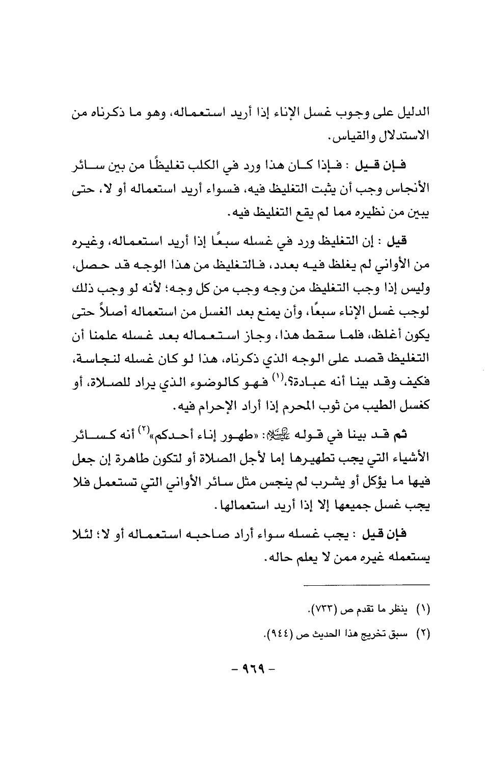 ثم قد بينا في قوله عليه السلام: (طهور إناء أحدكم) أنه كسائر الأشياء التي يجب تطهيرها إما لأجل الصلاة أو لتكون طاهرة إن جعل فيها ما يؤكل أو يشرب لم ينجس مثل سائر الأواني التي تستعمل فلا يجب غسل جميعها إلا إذا أريد استعمالها.