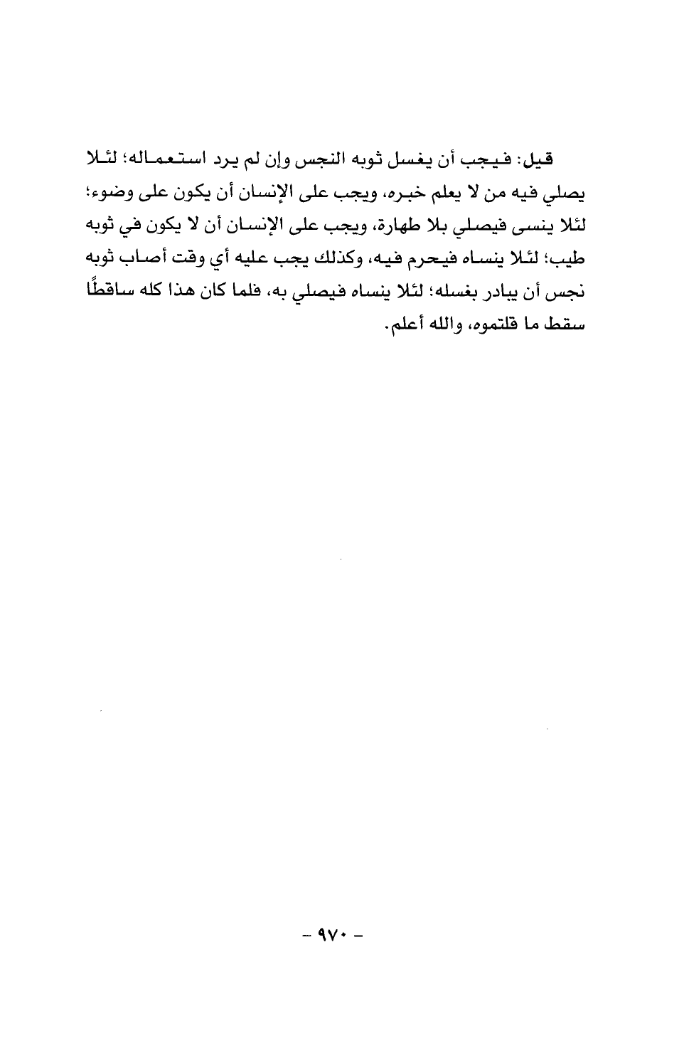 قيل: فيجب أن يغسل ثوبه النجس وإن لم يرد استعماله؛ لئلا يصلي فيه من لا يعلم خبره، ويجب على الإنسان أن يكون على وضوء؛ لئلا ينسى فيصلي بلا طهارة، ويجب على الإنسان أن لا يكون في ثوبه طيب؛ لئلا ينساه فيحرم فيه، وكذلك يجب عليه أن وقت أصاب ثوبه نجس أن يبادر بغسله؛ لئلا ينساه فيصلي به، فلما كان هذا كله ساقطا سقط ما قلتموه، والله أعلم.