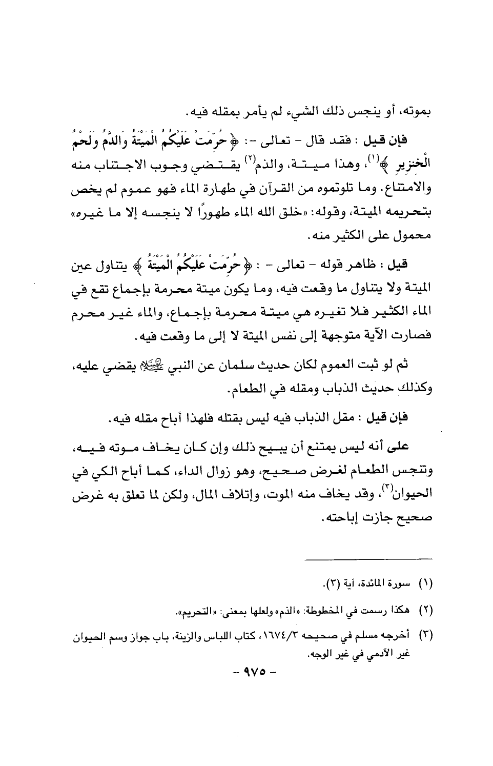 فإن قيل: فقد قال - تعالى -: {حرمت عليكم الميتة والدم ولحم الخنزير}، وهذا ميتة، والذم يقتضي وجوب الاجتناب منه والامتناع. وما تلوتموه من القرآن في طهارة الماء فهو عموم لم يخص بتحريمه الميتة، وقوله: (خلق الله الماء طهورا لا ينجسه إلا ما غيره) محمول على الكثير منه.