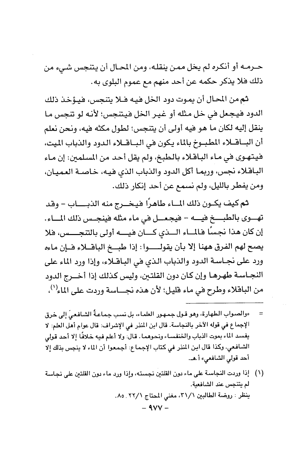 ثم كيف يكون ذلك الماء طاهرا فيخرج منه الذباب - وقد تهوى بالطبخ فيه - فيجعل في ماء مثله فينجس ذلك الماء. وإن كان هذا نجسا فالماء الذي كان فيه أولى بالتنجس، فلا يصح لهم الفرق ههنا إلا بأن يقولوا: إذا طبخ الباقلاء فإن ماءه ورد على نجاسة الدود والذباب الذي في الباقلاء، وإذا ورد الماء على النجاسة طهرها وإن كان دود القلتين، وليس كذلك إذا أخرج الدود في الباقلاء وطرح في ماء قليل؛ لأن هذه نجاسة وردت على الماء، وهذا قد تكلمنا عليه.