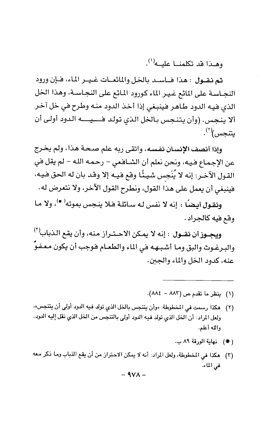 ثم نقول: هذا فاسد بالخل والمائعات غير الماء، فإن ورود النجاسة على المائع غير الماء كورود المائع على النجاسة، وهذا الخل الذي فيه الدود طاهر فينبغي إذا أخذ الدود منه وطرح في خل آخر ألا ينجس. (وأن يتنجس بالخل الذي تولد فيه الدود أولى أن يتنجس).