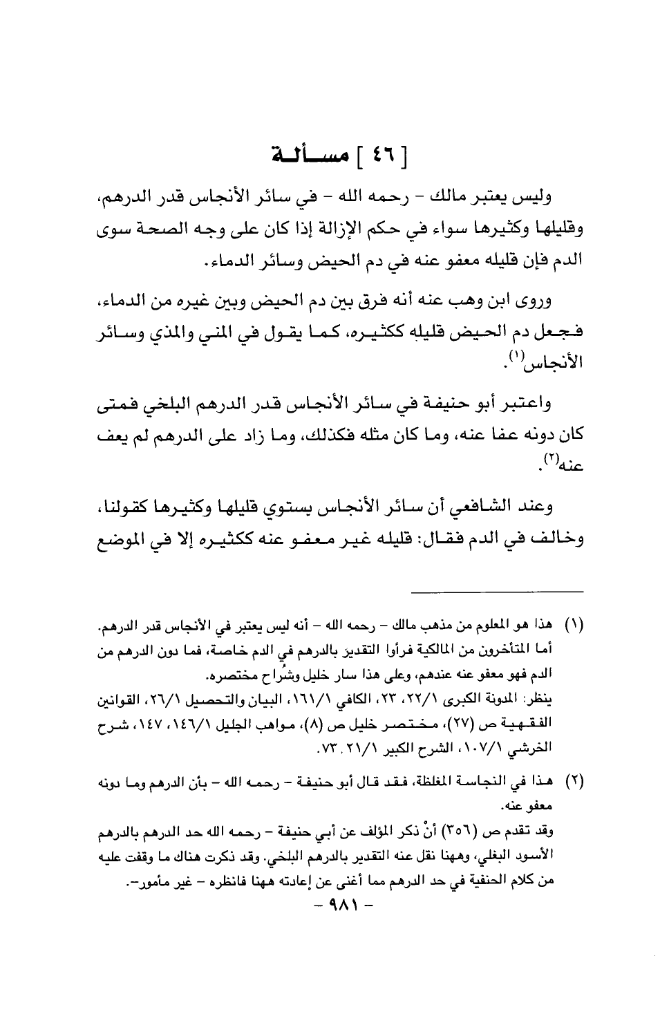 وليس يعتبر مالك - رَحمَه الله - في سائر الأنجاس قدر الدرهم، وقليلها وكثيرها سواء في حكم الإزالة إذا كان على وجه الصحة سوى الدم فإن قليله معفو عنه في دم الحيض وسائر الدماء.