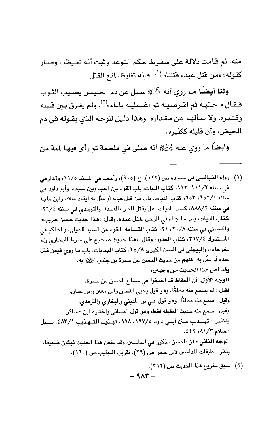 ولنا أيضا ما روي أنه عليه السلام سئل عن دم الحيض يصيب الثوب فقال: (حتيه ثم اقرصيه ثم اغسليه بالماء)، ولم يفرق بين قليله وكثيره، ولا سألها عن مقداره، وهذا دليل للوجه الذي يقوله في دم الحيض، وأن قليله ككثيره.