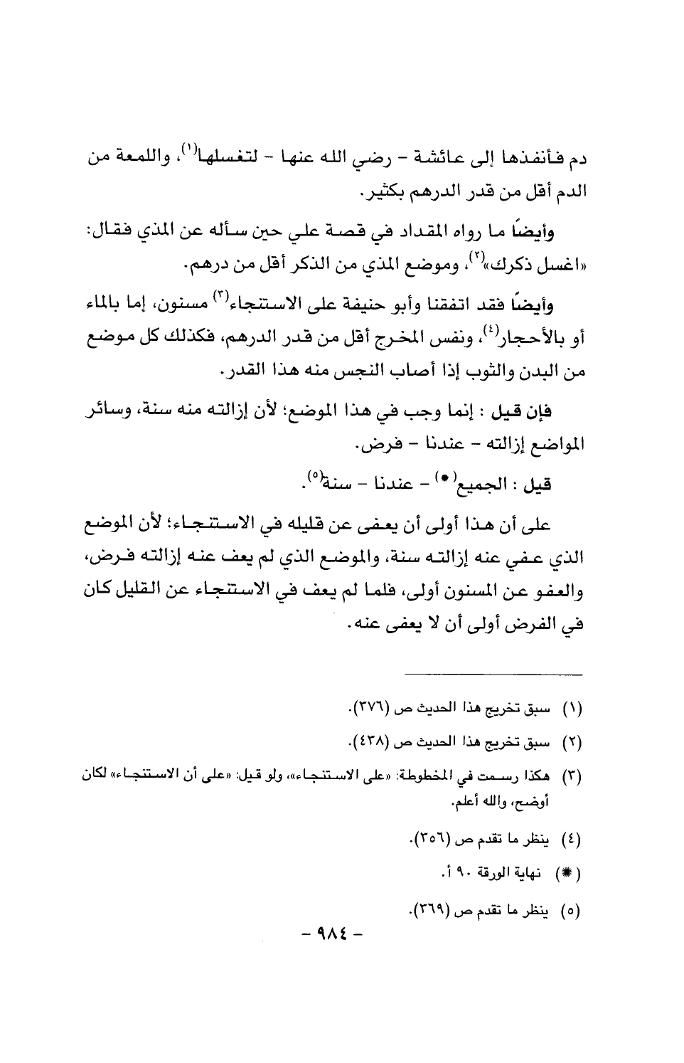 على أن هذا أولى أن يعفى عن قليله في الاستنجاء؛ لأن الموضع الذي عفي عنه إزالته سنة، والموضع الذي لم يعف عنه إزالته فرض، والعفو عن المسنون أولى، فلما لم يعف في الاستنجاء عن القليل كان في الفرض أولى أن لا يعفى عنه.