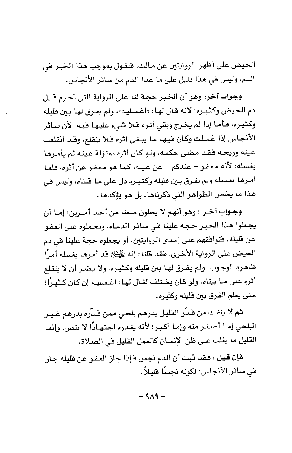 وجواب آخر: وهو أنهم لا يخلون معنا من أحد أمرين: إما أن يجعلوا هذا الخبر حجة علينا في سائر الدماء، ويحملوه على العفو عن قليله، فنوافقهم على إحدى الروايتين. أو يجعلوه حجة علينا في دم الحيض على الرواية الأخرى، فقد قلنا: إنه عليه السلام قد أمرها بغسله أمرا ظاهره الوجوب، ولم يفرق لها بين قليله وكثيره، ولا يضر أن ينقلع أثره على ما بيناه. ولو كان يختلف لقال لها: اغسليه إن كان كثيرا؛ حتى يعلم الفرق بين قليله وكثيره.
