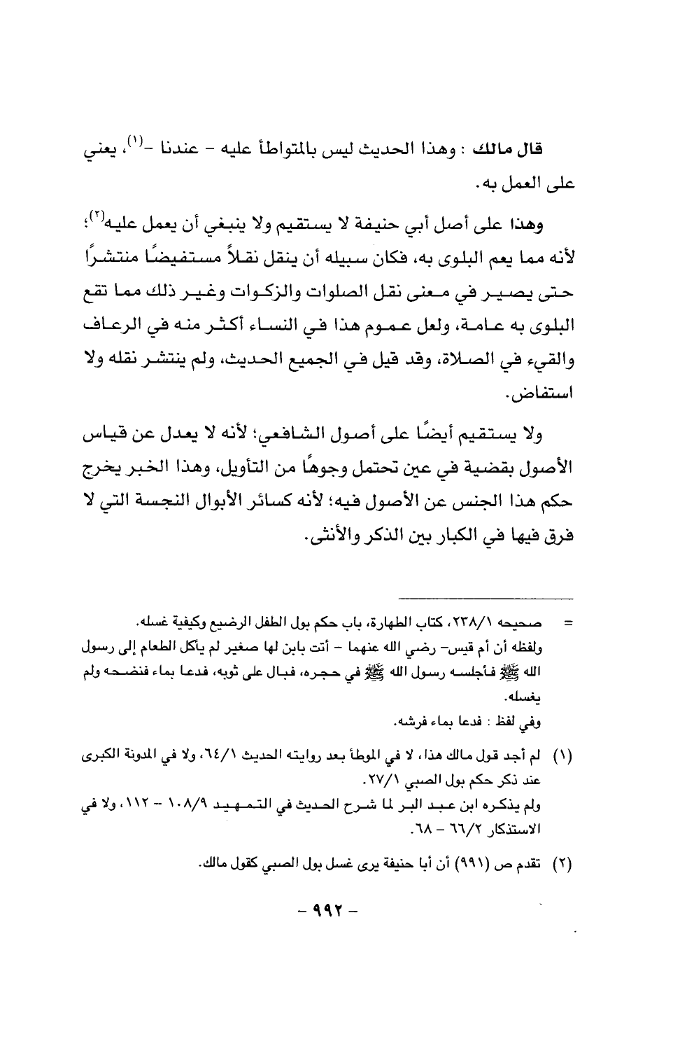 ولا يستقيم أيضا على أصول الشافعي؛ لأنه لا يعدل عن قياس الأصول بقضية في عين تحمل وجودها من التأويل وهذا الخبر يخرج حكم هذا الجنس عن الأصول فيه؛ لأنه كسائر الأبوال النجسة التي لا فرق فيها في الكبار بين الذكر والأنثى.