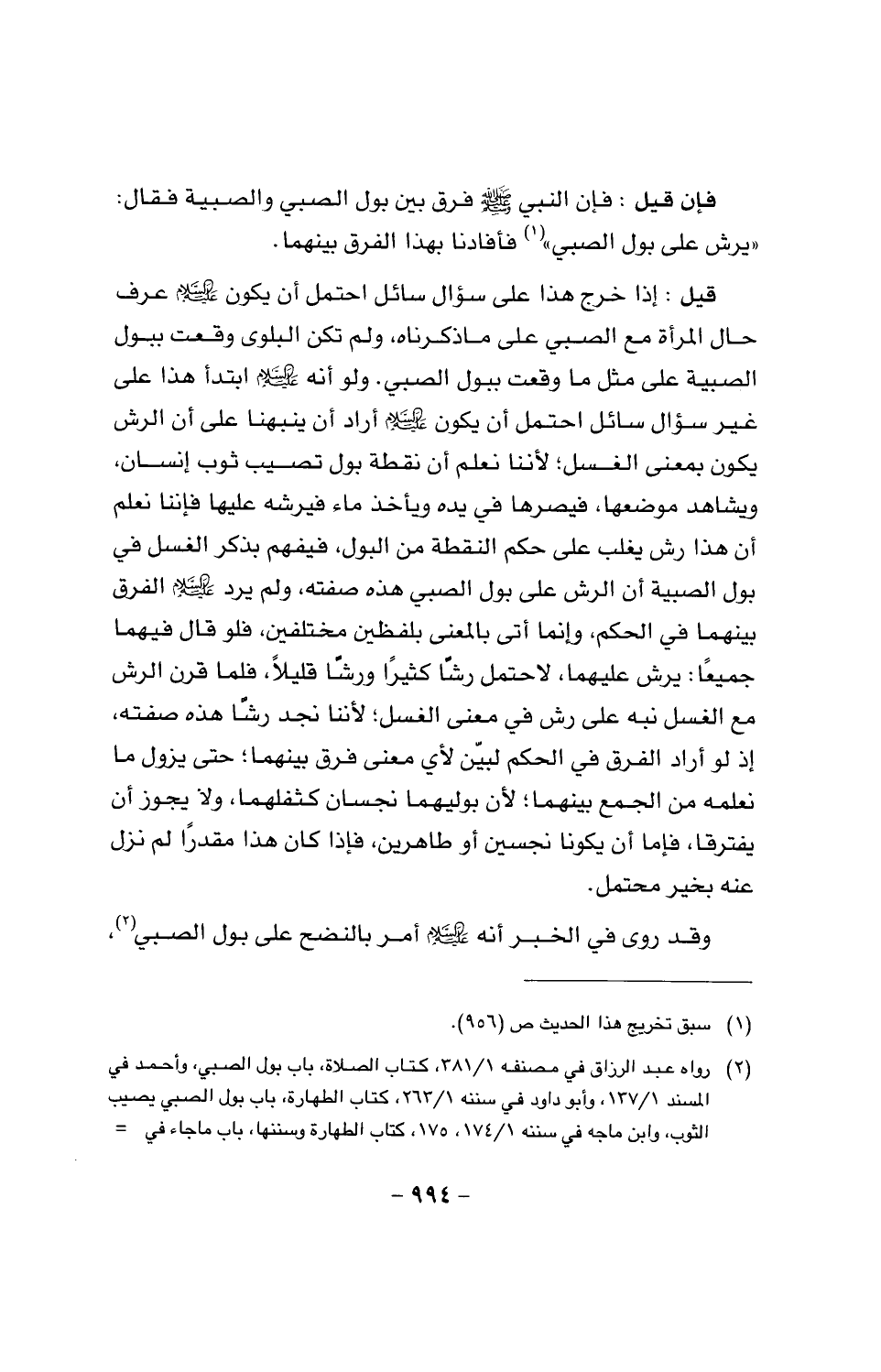 قيل: إذا خرج هذا على سؤال سائل احتمل أن يكون عليه السلام عرف حال المرأة مع الصبي على ما ذكرناه، ولم تكن البلوى وقعت ببول الصبية على مثل ما وقعت ببول الصبي. ولو أنه عليه السلام ابتدأ هذا على غير سؤال سائل احتمل أن يكون عليه السلام أراد أن ينبهنا على أن الرش يكون بمعنى الغسل؛ لأننا نعلم أن نقطة بول تصيب ثوب إنسان؛ ويشاهد موضعها، فيصرها في يده ويأخذ ماء فيرشه عليها فإننا نعلم أن هذا رش يغلب على حكم النقطة من البول، فيفهم بذكر الغسل في بول الصبية أن الرش على بول الصبي هذه صفته، ولم يرد عليه السلام الفرق بينهما في الحكم وإنما أتى بالمعنى بلفظين مختلفين، فلو قال فيهما جميعا: يرش عليهما، لاحتمل رشا كثيرا ورشا قليلا، فلما قرن الرش مع الغسل نبه على رش في معنى الغسل؛ لأننا نجد رشا هذه صفته، إذ لو أراد الفرق في الحكم لبين لأي معنى فرق بينهما؛ حتى يزول ما نعلمه من الجميع بينهما؛ لأن بوليهما نجسان كثفلهما، ولا يجوز أن يفترقا، فإما أن يكونا نجسين أو طاهرين، فإذا كان هذا مقدرا لم نزل عنه بخير محتمل.