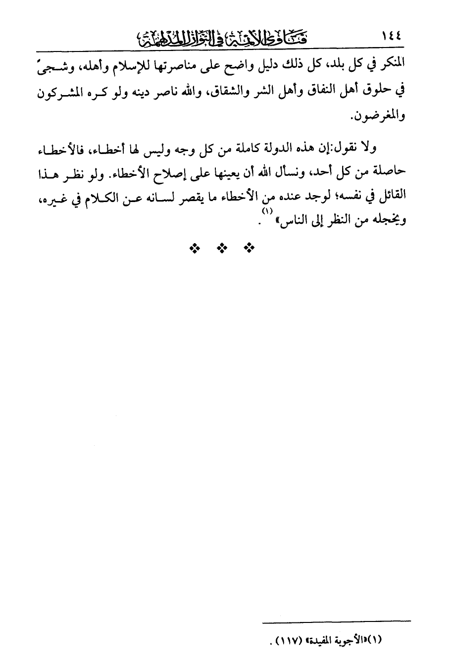 لهم ما يجب عليهم بالكتابات والأشرطة المفيدة والمحاضرات النافعة، وخطب الجمع الهادفة التي توضح الحق وتدعو إليه، وتبين الباطل وتحذر منه، مع الزيارات المفيدة للحكام والمسئولين، والمناصحة كتابة أو مشافهة بالرفق والحكمة والأسلوب الحسن، عملا بقول الله عز وجل في وصف نبيه محمد صلى الله عليه وسلم: {فبما رحمة من الله لنت لهم ولو كنت فظا غليظ القلب لانفضوا من حولك} (¬1)، الآية. وقوله عز وجل - لموسى وهارون عليهما الصلاة والسلام لما أرسلهما إلى فرعون: {فقولا له قولا لينا لعله يتذكر أو يخشى} (¬2)، وقول النبي صلى الله عليه وسلم: " يسروا ولا تعسروا وبشروا ولا تنفروا، ولا تطاوعوا ولا تختلفوا) (¬3)، وقوله صلى الله عليه وسلم: " إن الرفق لا يكون في شيء إلا زانه ولا ينزع من شيء إلا شانه " (¬4)، وقوله صلى الله عليه وسلم: " من يحرم الرفق يحرم الخير كله " (¬5)، وكل هذه الأحاديث صحيحة ثابتة عن رسول الله صلى الله عليه وسلم (¬6).
