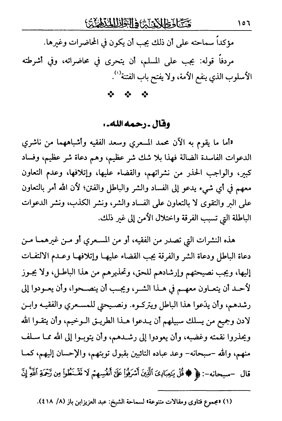 قاتلوا أمير المؤمنين علي بن أبي طالب رضي الله عنه ومن معه من الصحابة وأهل بيعة الرضوان، قاتلوه يريدون الإصلاح؛ وهم رأس الفساد، ورأس البدعة ورأس الشقاق، فهم الذين فرقوا كلمة المسلمين، وأضعفوا جانب المسلمين، وهكذا أيضا الذي يقول بها، ويتبناها، ويحسنها؛ فهذا سيئ المعتقد، ويجب أن يبتعد عنه، لأنه شخص ضار لأمته ولجلسائه ولمن هو من بينهم، والكلمة الحق أن يكون المسلم عامل بناء، وداعيا للخير؛ وملتمسا للخير تماما، ويقول الحق، ويدعو بالتي هي أحسن، وباللين، ويحسن الظن بإخوانه، ويعلم أن الكمال منال صعب، وأن المعصوم هو النبي صلى الله عليه وسلم وأن لو ذهب هؤلاء لم يأت أحسن منهم، فلو ذهب هؤلاء الناس الموجودون؛ سواء منهم الحكام أو المسئولون أو طلبة العلم أو الشعب، لو ذهب هذا كله - شعب أي بلد - لجاء أسوأ منه، فإنه لا يأتي عام إلا والذي بعده شر منه، فالذي يريد من الناس أن يصلوا إلى درجة الكمال أو أن يكونوا معصومين من الأخطاء والسيئات، هذا إنسان ضال، هؤلاء هم الخوارج، هؤلاء هم الذين فرقوا كلمة الناس، وآذوهم، هذه مقاصد المناوئين لأهل السنة والجماعة بالبدع؛ من الرافضة والخوارج والمعتزلة وسائر ألوان أهل الشر والبدع (¬1).