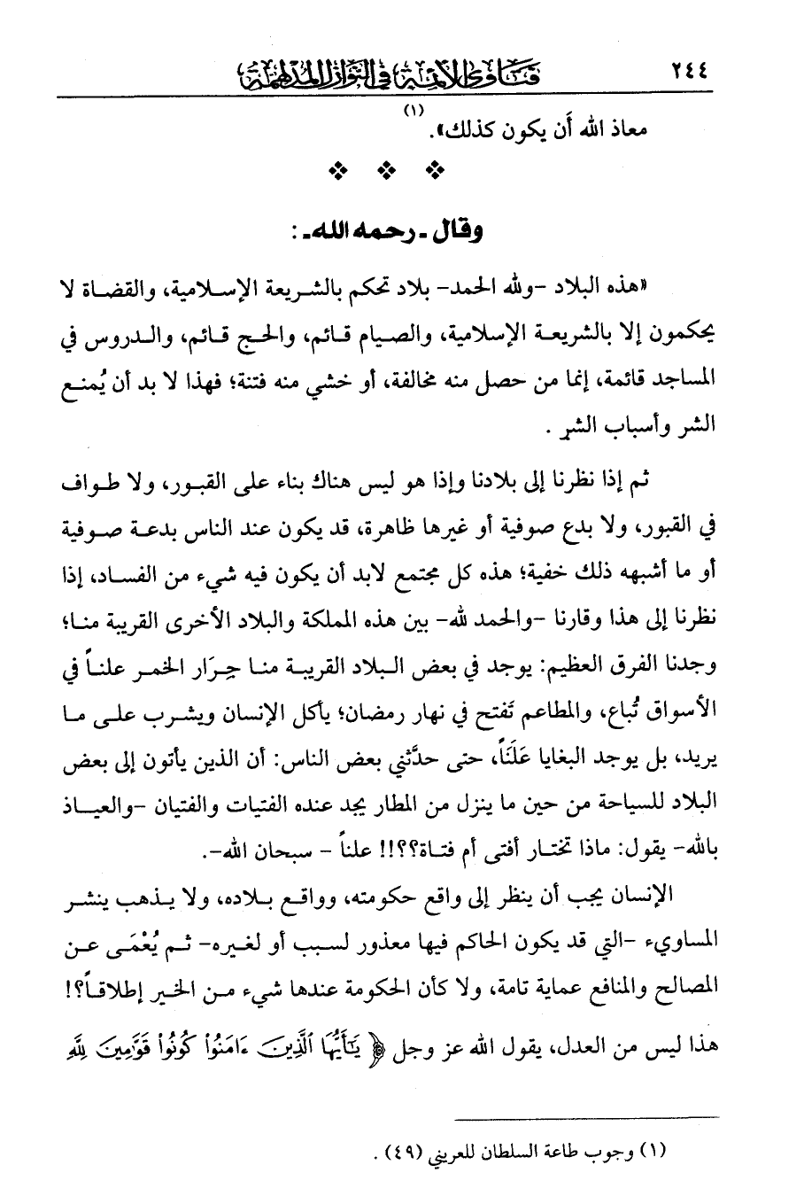 وإذا كان هؤلاء الذين ثبت ضلالهم بالنص والإجماع لم يكفروا مع أمر رسول الله -صلى الله عليه وسلم- بقتالهم، فكيف بالطوائف المختلفين الذين اشتبه عليهم الحق في مسائل غلط فيها من هو أعلم منهم؟ فلا يحل لأحد من هذه الطوائف أن تكفر الأخرى، ولا تستحل دمها ومالها وإن كانت فيها بدعة محققة، فكيف إذا كانت المكفرة لها مبتدعة أيضا؟