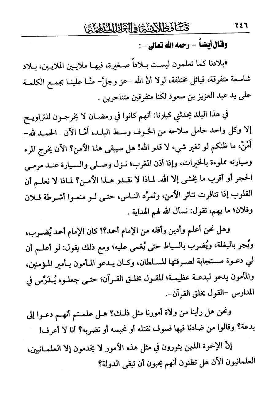 فهكذا السلف قاتل بعضهم بعضا من أهل الجمل وصفين ونحوه، وكلهم مسلمون مؤمنون كما قال تعالى: {وَإِنْ طَائِفَتَانِ مِنَ الْمُؤْمِنِينَ اقْتَتَلُوا فَأَصْلِحُوا بَيْنَهُمَا فَإِنْ بَغَتْ إِحْدَاهُمَا عَلَى الْأُخْرَى فَقَاتِلُوا الَّتِي تَبْغِي حَتَّى تَفِيءَ إِلَى أَمْرِ اللَّهِ فَإِنْ فَاءَتْ فَأَصْلِحُوا بَيْنَهُمَا بِالْعَدْلِ وَأَقْسِطُوا إِنَّ اللَّهَ يُحِبُّ الْمُقْسِطِينَ} (¬3) فقد بين الله تعالى أنهم مع اقتتالهم وبغي بعضهم على بعض أخوة مؤمنون، وأمر بالتصالح بينهم بالعدل، ولهذا كان السلف مع الاقتتال يوالي بعضهم بعضا موالاة الدين، ولا يعادون كمعاداة الكفار، فيقبل بعضهم شهادة بعض، ويأخذ بعضهم العلم عن بعض، ويتوارثون،