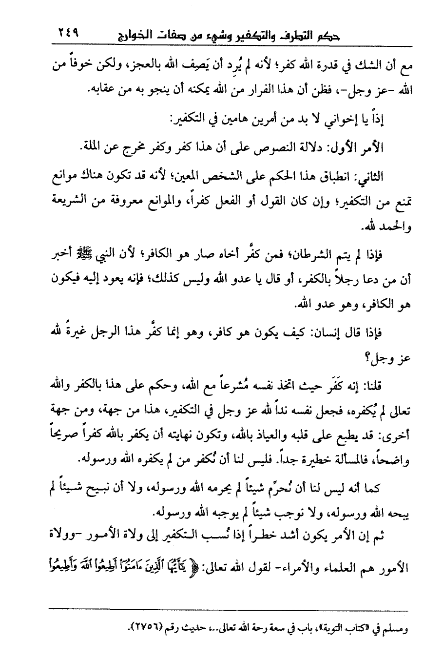 أولا: الواجب على كل مؤمن بالله جل وعلا يرجو لقاءه ويخشى لقاءه: أن يحذر أتم الحذر أن يقول بلا علم، وأن يجترئ على ما ليس له به حجة، سيما في مسائل الاعتقاد، ومسائل الإيمان والتكفير، ومسائل الحلال والحرام، وإذا كان في الحلال والحرام قال الله جل وعلا: {وَلَا تَقُولُوا لِمَا تَصِفُ أَلْسِنَتُكُمُ الْكَذِبَ هَذَا حَلَالٌ وَهَذَا حَرَامٌ لِتَفْتَرُوا عَلَى اللَّهِ الْكَذِبَ إِنَّ الَّذِينَ يَفْتَرُونَ عَلَى اللَّهِ الْكَذِبَ لَا يُفْلِحُونَ} {مَتَاعٌ قَلِيلٌ وَلَهُمْ عَذَابٌ أَلِيمٌ} [النحل: آية 116 - 117].