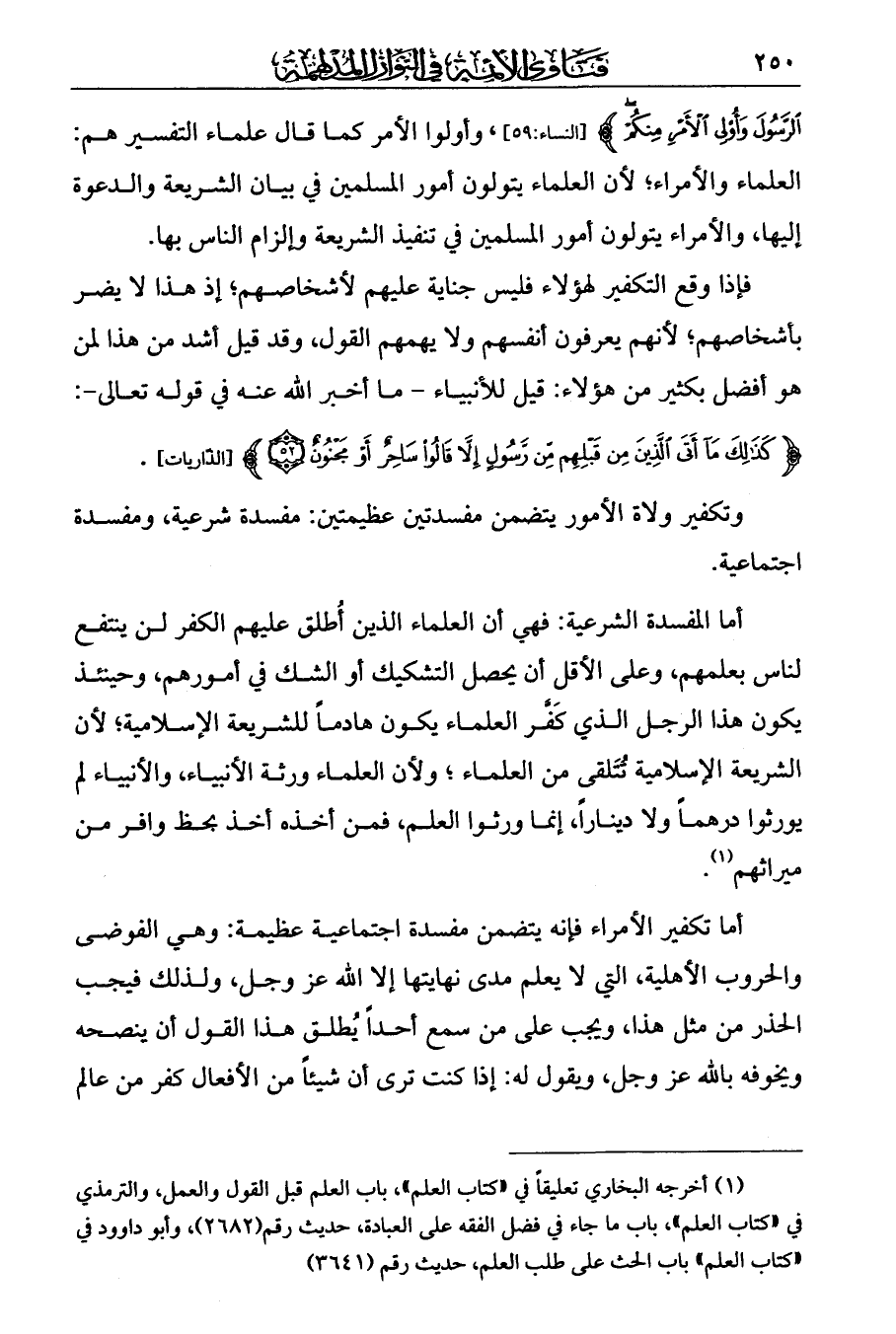 الحديث: " من أفتي لفتوى من غير ثبت فإنما إثمه على من أفتاه" (¬1) ومن أعظم ما وقع في الأمة من الانحراف عن الحق: تكفير المسلم الذي ثبت إسلامه، وعدم الاستبيان منه، وهذا كان له بوادر في زمن الصحابة في زمن النبي -صلى الله عليه وسلم- فعلمنا النبي -صلى الله عليه وسلم- كيف تعالج هذه البوادر، كيف ينظر في هذا الأمر؟