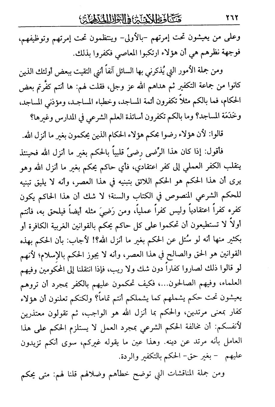 ولكن أسأت في قولك: إن ما أنكره شيخنا الوالد من تكفيركم أهل الحق، واعتقاد أصابتكم أنه لم يصدر منكم. وتذكر أن إخوانك من أهل "النقيع" يجادلونك، وينازعونك في شأننا، وأنهم ينسبوننا إلى السكوت عن بعض الأمور. وأنت تعرف أنهم يذكرون هذا غالبا على سبيل القدح في العقيدة والطعن في الطريقة، وإن لم يصرحوا بالتكفير، فقد حاموا حول الحمى، فنعوذ بالله من الضلال بعد الهدى، ومن الغي عن سبيل الرشد والعمى.