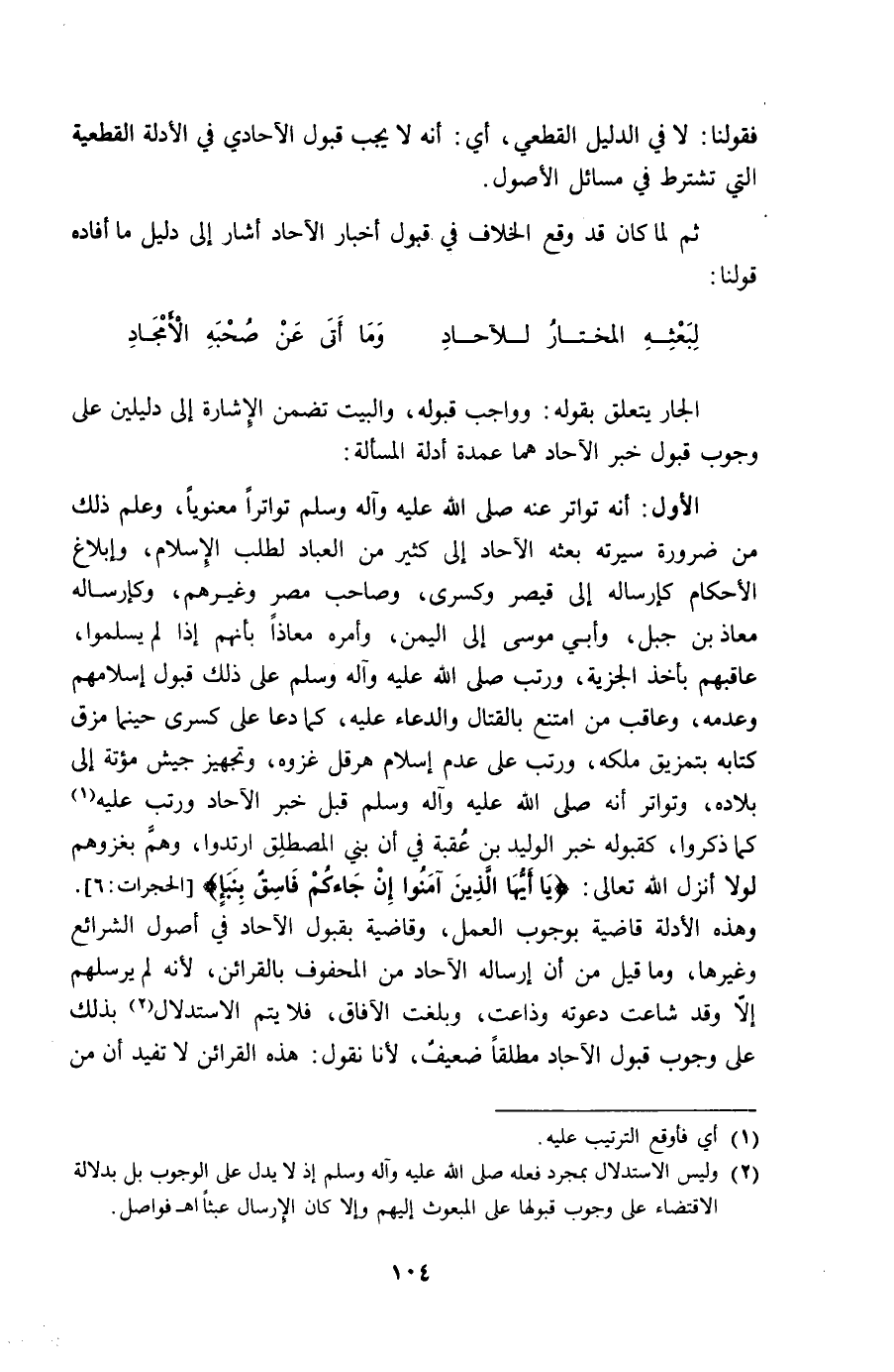 الأول أَنه تَوَاتر عَنهُ صلى الله عَلَيْهِ وَسلم تواترا معنويا وَعلم ذَلِك من ضَرُورَة سيرته بَعثه الْآحَاد إِلَى كثير من الْعباد لطلب الْإِسْلَام وإبلاغ الْأَحْكَام كإرساله إِلَى قَيْصر وكسرى وَصَاحب مصر وَغَيرهم وكإرساله معَاذ بن جبل وَأبي مُوسَى إِلَى الْيمن وَأمره معَاذًا بِأَنَّهُم إِذا لم يسلمُوا عاقبهم بِأخذ الْجِزْيَة ورتب صلى الله عَلَيْهِ وَسلم على ذَلِك قبُول إسْلَامهمْ وَعَدَمه وعاقب من امْتنع بِالْقِتَالِ وَالدُّعَاء عَلَيْهِ كَمَا دَعَا على كسْرَى حينما مزق كِتَابه بتمزيق ملكه ورتب على عدم إِسْلَام هِرقل غَزوه وتجهيز جَيش مُؤْتَة إِلَى بِلَاده وتواتر أَنه صلى الله عَلَيْهِ وَسلم قبل خبر الْآحَاد ورتب عَلَيْهِ كَمَا ذكرُوا كقبوله خبر الْوَلِيد بن عقبَة فِي أَن بني المصطلق ارْتَدُّوا وهم بغزوهم لَوْلَا أنزل الله تَعَالَى {يَا أَيهَا الَّذين آمنُوا إِن جَاءَكُم فَاسق بِنَبَأٍ} وَهَذِه الْأَدِلَّة قاضية بِوُجُوب الْعَمَل وقاضية بِقبُول الْآحَاد فِي أصُول الشَّرَائِع وَغَيرهَا وَمَا قيل من أَن إرْسَاله الْآحَاد من المحفوف بالقرائن لِأَنَّهُ لم يرسلهم إِلَّا وَقد شاعت دَعوته وذاعت وَبَلغت الْآفَاق فَلَا يتم الِاسْتِدْلَال بذلك على وجوب قبُول الْآحَاد مُطلقًا ضَعِيف لأَنا نقُول هَذِه الْقَرَائِن لَا تفِيد أَن من