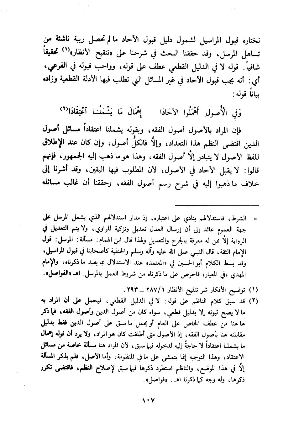 فَإِن المُرَاد بالأصول أصُول الْفِقْه وَبِقَوْلِهِ يشملنا اعتقادا مسَائِل أصُول الدّين اقْتضى النّظم هَذَا التعداد وَإِلَّا فَالْكل أصُول وَإِن كَانَ عِنْد الْإِطْلَاق للفظ الْأُصُول لَا يتَبَادَر إِلَّا أصُول الْفِقْه وَهَذَا هُوَ مَا ذهب إِلَيْهِ الْجُمْهُور فَإِنَّهُم قَالُوا لَا يقبل الْآحَاد فِي الْأُصُول لِأَن الْمَطْلُوب فِيهَا الْيَقِين وَقد أَشَرنَا إِلَى خلاف مَا ذَهَبُوا إِلَيْهِ فِي شرح رسم أصُول الْفِقْه وحققنا أَن غَالب مسَائِله