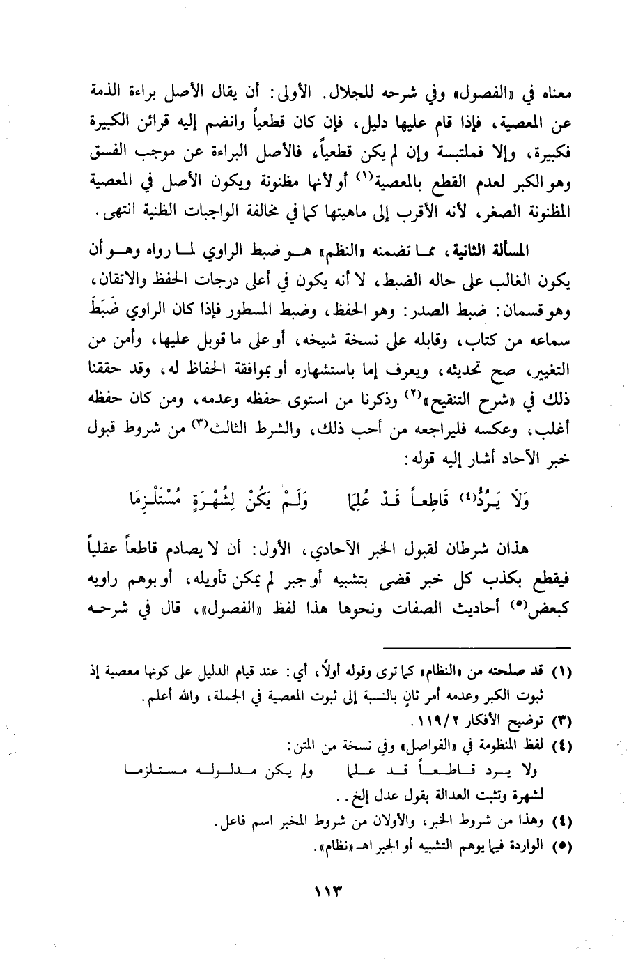 هَذَانِ شَرْطَانِ لقبُول الْخَبَر الآحادي الأول أَن لَا يصادم قَاطعا عقليا فَيقطع بكذب كل خبر قضى بتشبيه أَو جبر لم يُمكن تَأْوِيله أَو بوهم رَاوِيه كبعض أَحَادِيث الصِّفَات وَنَحْوهَا هَذَا لفظ الْفُصُول قَالَ فِي شَرحه