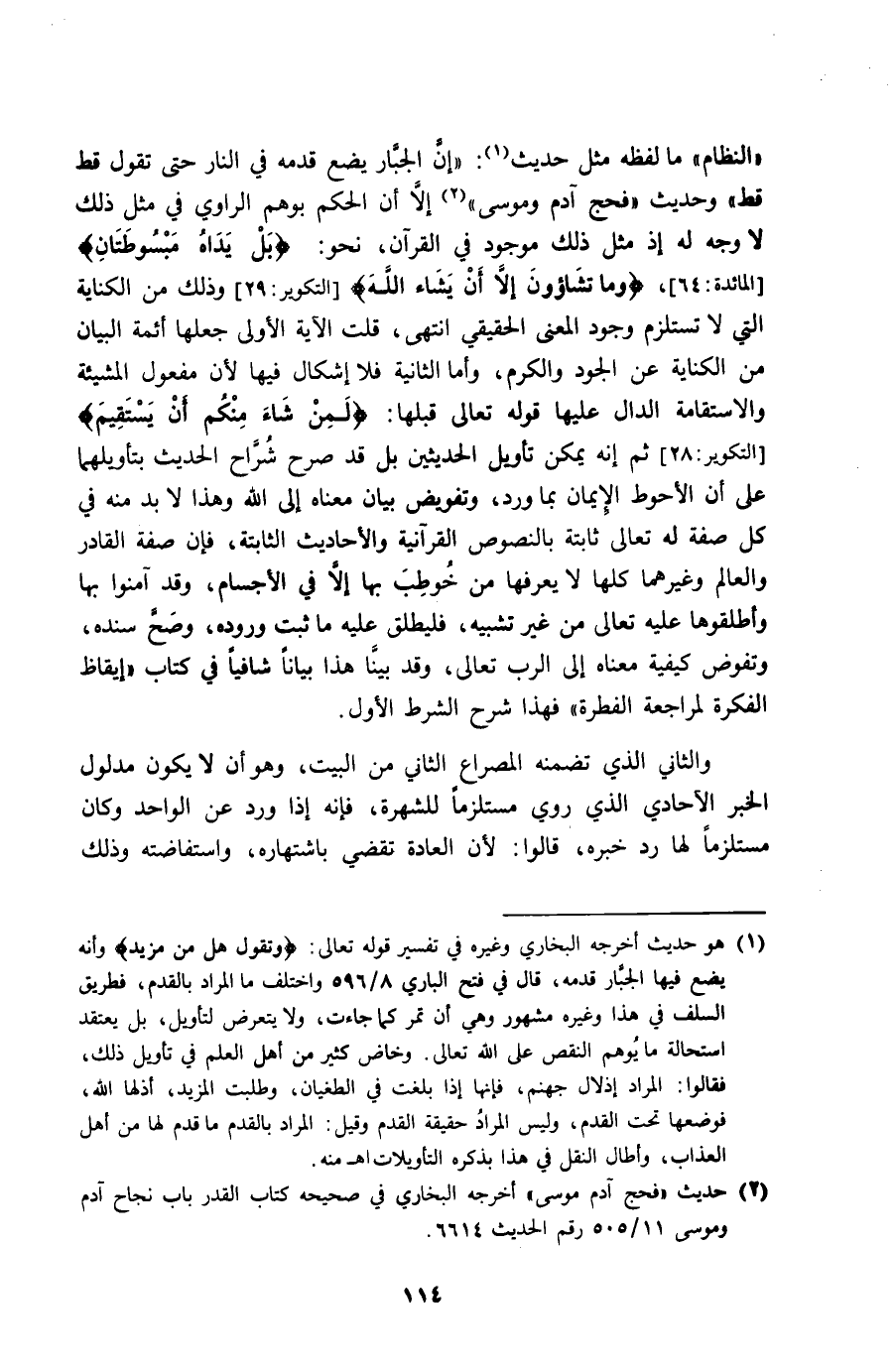 الله تبَارك وَتَعَالَى رَضِي الله عَنْهُن الرب عز وَجل النظام مَا لَفظه مثل حَدِيث إِن الْجَبَّار يضع قدمه فِي النَّار حَتَّى تَقول قطّ قطّ وَحَدِيث فحج آدم ومُوسَى إِلَّا أَن الحكم بوهم الرَّاوِي فِي مثل ذَلِك لَا وَجه لَهُ إِذْ مثل ذَلِك مَوْجُود فِي الْقُرْآن نَحْو {بل يَدَاهُ مبسوطتان} {وَمَا تشاؤون إِلَّا أَن يَشَاء الله} وَذَلِكَ من الْكِنَايَة الَّتِي لَا تَسْتَلْزِم وجود الْمَعْنى الْحَقِيقِيّ انْتهى قلت الْآيَة الأولى جعلهَا أَئِمَّة الْبَيَان من الْكِنَايَة عَن الْجُود وَالْكَرم وَأما الثَّانِيَة فَلَا إِشْكَال فِيهَا لِأَن مفعول الْمَشِيئَة والاستقامة الدَّال عَلَيْهَا قَوْله تَعَالَى قبلهَا {لمن شَاءَ مِنْكُم أَن يَسْتَقِيم} ثمَّ إِنَّه يُمكن تَأْوِيل الْحَدِيثين بل قد صرح شرَّاح الحَدِيث بتأويلهما على أَن الْأَحْوَط الْإِيمَان بِمَا ورد وتفويض بَيَان مَعْنَاهُ إِلَى الله وَهَذَا لَا بُد مِنْهُ فِي كل صفة لَهُ تَعَالَى ثَابِتَة بالنصوص القرآنية وَالْأَحَادِيث الثَّابِتَة فَإِن صفة الْقَادِر والعالم وَغَيرهمَا كلهَا لَا يعرفهَا من خُوطِبَ بهَا إِلَّا فِي الْأَجْسَام وَقد آمنُوا بهَا وأطلقوها عَلَيْهِ تَعَالَى من غير تَشْبِيه فليطلق عَلَيْهِ مَا ثَبت وُرُوده وَصَحَّ سَنَده وتفوض كَيْفيَّة مَعْنَاهُ إِلَى الرب تَعَالَى وَقد بَينا هَذَا بَيَانا شافيا فِي كتاب إيقاظ الفكرة لمراجعة الْفطْرَة فَهَذَا شرح الشَّرْط الأول