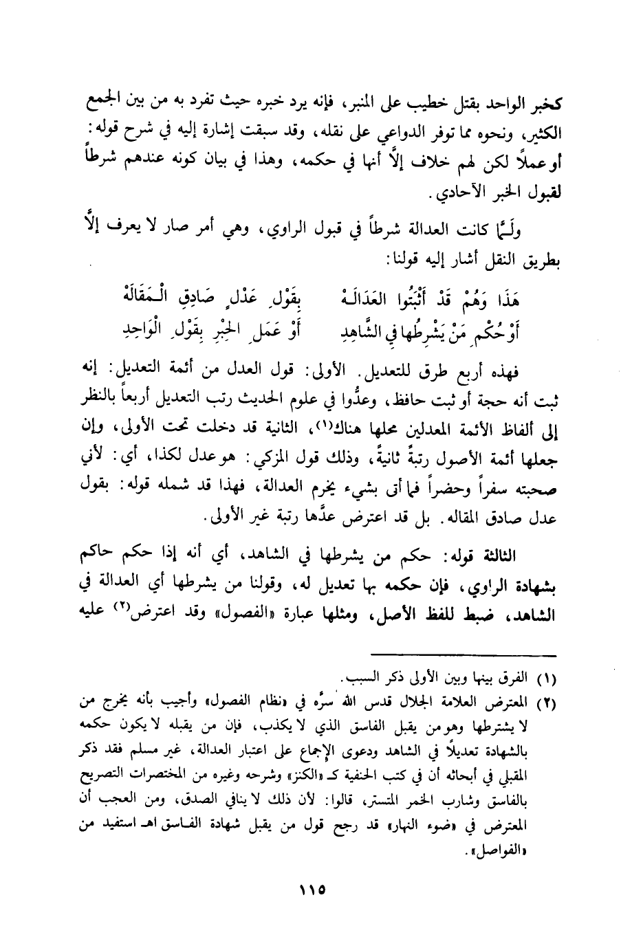 وَلما كَانَت الْعَدَالَة شرطا فِي قبُول الرَّاوِي وَهِي أَمر صَار لَا يعرف إِلَّا بطرِيق النَّقْل أَشَارَ إِلَيْهِ قَوْلنَا