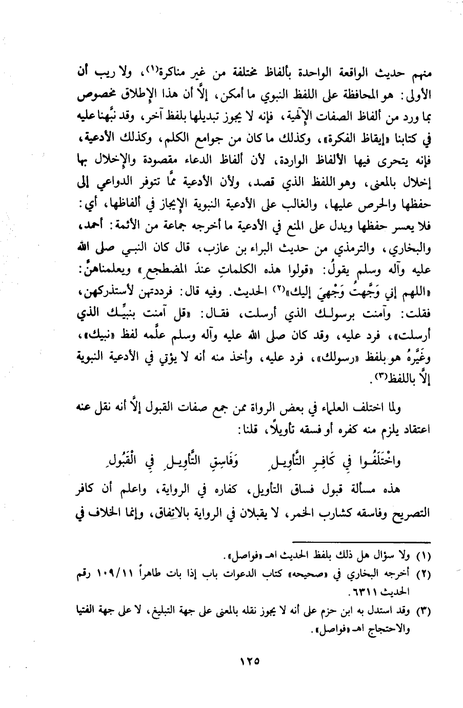 مِنْهُم حَدِيث الْوَاقِعَة الْوَاحِدَة بِأَلْفَاظ مُخْتَلفَة من غير مناكرة وَلَا ريب أَن الأولى هُوَ الْمُحَافظَة على اللَّفْظ النَّبَوِيّ مَا أمكن إِلَّا أَن هَذَا الْإِطْلَاق مَخْصُوص بِمَا ورد من أَلْفَاظ الصِّفَات الإلهية فَإِنَّهُ لَا يجوز تبديلها بِلَفْظ آخر وَقد نبهنا عَلَيْهِ فِي كتَابنَا إيقاظ الفكرة وَكَذَلِكَ مَا كَانَ من جَوَامِع الْكَلم وَكَذَلِكَ الْأَدْعِيَة فَإِنَّهُ يتحَرَّى فِيهَا الْأَلْفَاظ الْوَارِدَة لِأَن أَلْفَاظ الدُّعَاء مَقْصُودَة والإخلال بهَا إخلال بِالْمَعْنَى وَهُوَ اللَّفْظ الَّذِي قصد وَلِأَن الْأَدْعِيَة مِمَّا تتوفر الدَّوَاعِي إِلَى حفظهَا والحرص عَلَيْهَا وَالْغَالِب على الْأَدْعِيَة النَّبَوِيَّة الإيجاز فِي ألفاظها أَي فَلَا يعسر حفظهَا وَيدل على الْمَنْع فِي الْأَدْعِيَة مَا أخرجه جمَاعَة من الْأَئِمَّة أَحْمد وَالْبُخَارِيّ وَالتِّرْمِذِيّ من حَدِيث الْبَراء بن عَازِب قَالَ كَانَ النَّبِي صلى الله عَلَيْهِ وَسلم يَقُول قُولُوا هَذِه الْكَلِمَات عِنْد المضطجع ويعلمناهن اللَّهُمَّ إِنِّي وجهت وَجْهي إِلَيْك الحَدِيث وَفِيه قَالَ فرددتهن لأستذركهن فَقلت وَآمَنت برسولك الَّذِي أرْسلت فَقَالَ قل آمَنت بنبيك الَّذِي أرْسلت فَرد عَلَيْهِ وَقد كَانَ صلى الله عَلَيْهِ وَسلم علمه لفظ نبيك وَغَيره هُوَ بِلَفْظ رَسُولك فَرد عَلَيْهِ وَأخذ مِنْهُ أَنه لَا يُؤْتِي فِي الْأَدْعِيَة النَّبَوِيَّة إِلَّا بِاللَّفْظِ