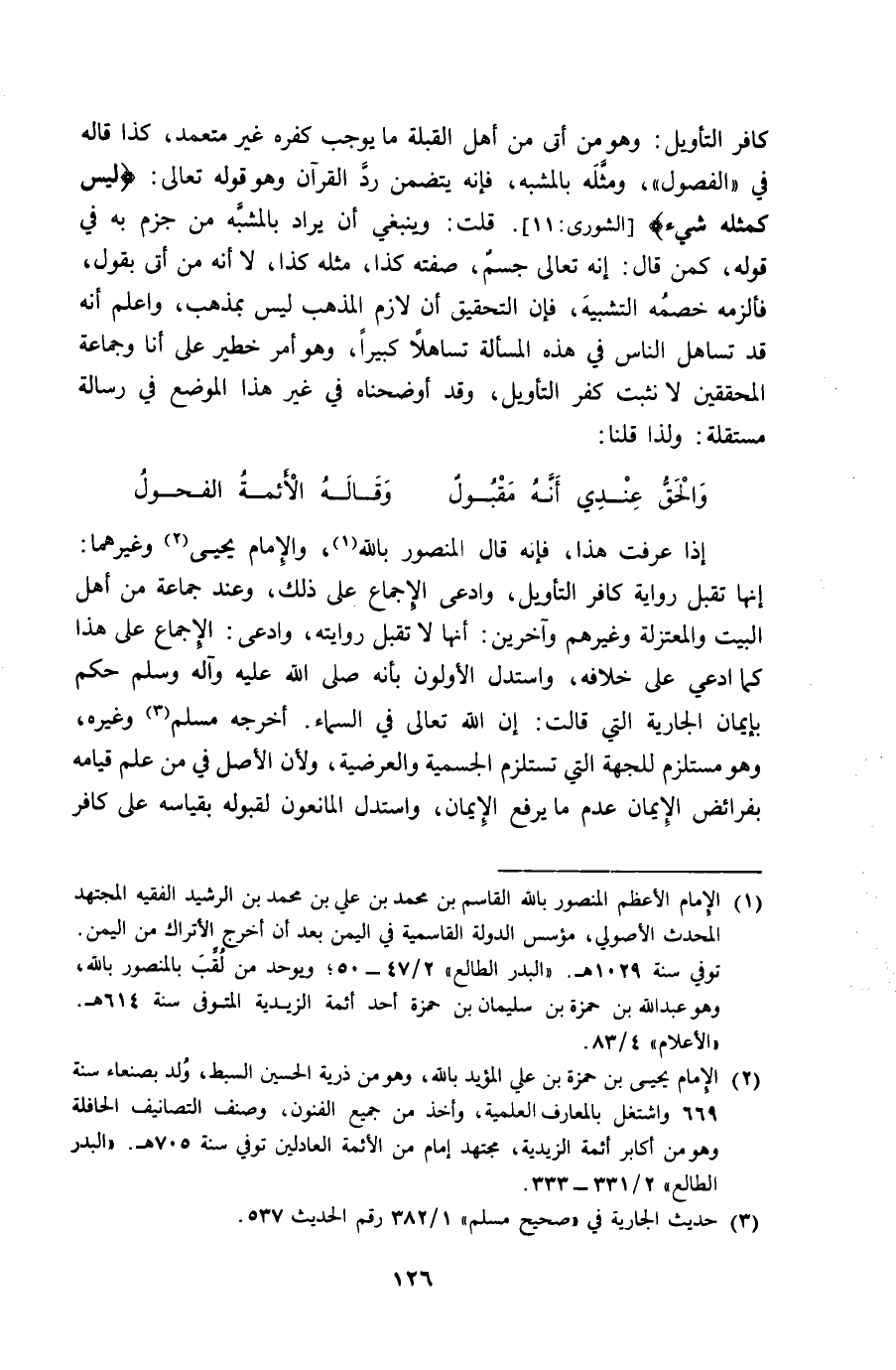 إِذا عرفت هَذَا فَإِنَّهُ قَالَ الْمَنْصُور بِاللَّه وَالْإِمَام يحيى وَغَيرهمَا إِنَّهَا تقبل رِوَايَة كَافِر التَّأْوِيل وَادّعى الْإِجْمَاع على ذَلِك وَعند جمَاعَة من أهل الْبَيْت والمعتزلة وَغَيرهم وَآخَرين أَنَّهَا لَا تقبل رِوَايَته وَادّعى الْإِجْمَاع على هَذَا كَمَا ادعِي على خِلَافه وَاسْتدلَّ الْأَولونَ بِأَنَّهُ صلى الله عَلَيْهِ وَسلم حكم بِإِيمَان الْجَارِيَة الَّتِي قَالَت إِن الله تَعَالَى فِي السَّمَاء أخرجه مُسلم وَغَيره وَهُوَ مُسْتَلْزم للجهة الَّتِي تَسْتَلْزِم الجسمية والعرضية وَلِأَن الأَصْل فِي من علم قِيَامه بفرائض الْإِيمَان عدم مَا يرفع الْإِيمَان وَاسْتدلَّ المانعون لقبوله بقياسه على كَافِر