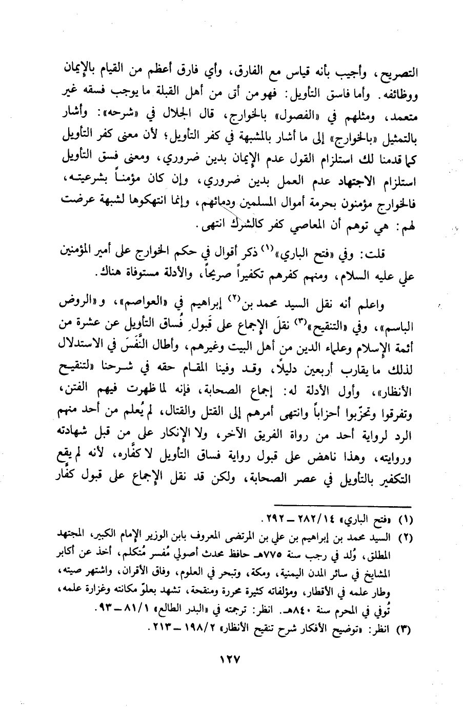 وَاعْلَم أَنه نقل السَّيِّد مُحَمَّد بن إِبْرَاهِيم فِي العواصم وَالرَّوْض الباسم وَفِي التَّنْقِيح نقل الْإِجْمَاع على قبُول فساق التَّأْوِيل عَن عشرَة من أَئِمَّة الْإِسْلَام وعلماء الدّين من أهل الْبَيْت وَغَيرهم وَأطَال النَّفس فِي الاستدال لذَلِك مَا يُقَارب أَرْبَعِينَ دَلِيلا وَقد وَفينَا الْمقَام حَقه فِي شرحنا لتنقيح الأنظار وَأول الْأَدِلَّة لَهُ إِجْمَاع الصَّحَابَة فَإِنَّهُ لما ظَهرت فيهم الْفِتَن وَتَفَرَّقُوا وتحزبوا وانْتهى أَمرهم إِلَى الْقَتْل والقتال لم يعلم من أحد مِنْهُم الرَّد لرِوَايَة وَهَذَا ناهض على قبُول رِوَايَة فساق التَّأْوِيل لَا كفاره لِأَنَّهُ لم يَقع التَّكْفِير بالتأويل فِي عصر الصَّحَابَة وَلَكِن قد نقل الْإِجْمَاع على قبُول كفار