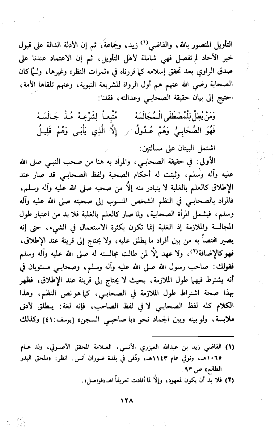 الأولى فِي حَقِيقَة الصَّحَابِيّ وَالْمرَاد بِهِ هُنَا من صحب النَّبِي صلى الله عَلَيْهِ وَسلم وَثبتت لَهُ أَحْكَام الصُّحْبَة وَلَفظ الصَّحَابِيّ قد صَار عِنْد الْإِطْلَاق كَالْعلمِ بالغلبة لَا يتَبَادَر مِنْهُ إِلَّا من صَحبه صلى الله عَلَيْهِ وَسلم فَالْمُرَاد بالصحابي فِي النّظم الشَّخْص الْمَنْسُوب إِلَى صحبته صلى الله عَلَيْهِ وَسلم فَيشْمَل الْمَرْأَة الصحابية وَلما صَار كَالْعلمِ بالغلبة فَلَا بُد من اعْتِبَار طول المجالسة والملازمة إِذْ الْغَلَبَة إِنَّمَا تكون بِكَثْرَة الِاسْتِعْمَال فِي الشَّيْء حَتَّى إِنَّه يصير مُخْتَصًّا بِهِ من بَين أَفْرَاد مَا يُطلق عَلَيْهِ وَلَا يحْتَاج إِلَى قرينَة عِنْد الْإِطْلَاق فَهُوَ كالإضافة وَلَا عهد إِلَّا لمن طَالَتْ مُجَالَسَته لَهُ صلى الله عَلَيْهِ وَسلم فقولك صَاحب رَسُول الله عَلَيْهِ وَآله وَسلم وصحابي مستويان فِي أَنه يشْتَرط فيهمَا طول الْمُلَازمَة بِحَيْثُ لَا يحْتَاج إِلَى قرينَة عِنْد الْإِطْلَاق فَظهر بِهَذَا صِحَة اشْتِرَاط طول الْمُلَازمَة فِي الصَّحَابِيّ كَمَا هُوَ نَص النّظم وَهَذَا الْكَلَام كُله لفظ الصاحب فَإِنَّهُ لُغَة يُطلق لأدنى مُلَابسَة وَلَو بَينه وَبَين الجماد نَحْو يَا صَاحِبي السجْن وَكَذَلِكَ