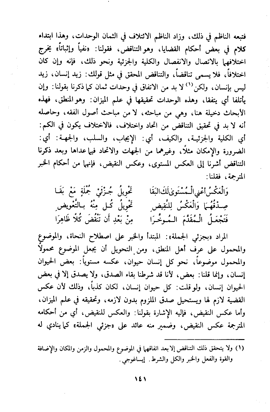 فَتَبِعَهُ النَّاظِم فِي ذَلِك وَزَاد النَّاظِم الائتلاف فِي الثمان الوحدات وَهَذَا ابْتِدَاء كَلَام فِي بعض أَحْكَام القضايا وَهُوَ التَّنَاقُض فقولنا نفيا وإثباتا يخرج اخْتِلَافهمَا بالاتصال والكلية والجزئية وَنَحْو ذَلِك فَإِنَّهُ وَإِن كَانَ اخْتِلَافا فَلَا يُسمى تناقضا والتناقض الْمُحَقق فِي مثل قَوْلك زيد إِنْسَان زيد لَيْسَ بِإِنْسَان وَلَكِن لَا بُد من الِاتِّفَاق فِي وحدات ثَمَان كَمَا ذكرنَا بقولنَا وَإِن يأتلفا أَي يتَّفقَا وَهَذِه الوحدات تحقيقها فِي علم الْمِيزَان وَهُوَ الْمنطق فَهَذِهِ الأبحاث دخيلة هُنَا وَهِي من مباحثه لَا من مبَاحث أصُول الْفِقْه وَحَاصِله أَنه لَا بُد فِي تَحْقِيق التَّنَاقُض من اتِّحَاد اخْتِلَاف فالاختلاف يكون فِي الْكمّ أَي الْكُلية والجزئية والكيف أَي الْإِيجَاب وَالسَّلب والجهة أَي الضَّرُورَة والإمكان مثلا وَغَيرهمَا من الْجِهَات والاتحاد فِيمَا عَداهَا وَبعد ذكرنَا التَّنَاقُض أَشَرنَا إِلَى الْعَكْس المستوى وَعكس النقيض فَإِنَّهُمَا من أَحْكَام الْخَبَر المترجمة فَقُلْنَا