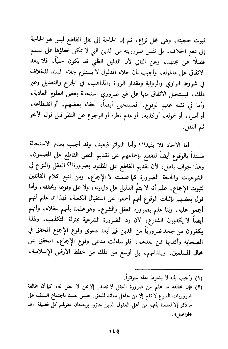 ثُبُوت حجيته وَهِي مَحل نزاع ثمَّ إِن الْحَاجة إِلَى نقل الْقَاطِع لَيْسَ هُوَ الْحَاجة إِلَى دفع الْخلاف بل نفس ضروريته من الدّين الَّتِي لَا يُمكن خفاؤها على مُسلم فضلا عَن مُجْتَهد وَعَن الثَّانِي لِأَن الدَّلِيل الظني قد يكون جليا فَلَا يبعد الِاتِّفَاق على مَدْلُوله وَأجِيب بِأَن جلاء الْمَدْلُول لَا يسْتَلْزم جلاء السَّنَد للْخلاف فِي شُرُوط الرَّاوِي وَالرِّوَايَة وَمِقْدَار الروَاة والمذاهب فِي الْجرْح وَالتَّعْدِيل وَغير ذَلِك فيستحيل الِاتِّفَاق مِنْهَا على غير ضَرُورِيّ اسْتِحَالَة بعض الْعُلُوم العادية وَأما فِي نَقله عَنْهُم لوُقُوع فمستحيل أَيْضا لخفاء بَعضهم أَو انْقِطَاعه أَو أسره أَو خموله أَو كذبه أَو عدم نظره أَو الرُّجُوع عَن النّظر قبل قَول الآخر ثمَّ النَّقْل