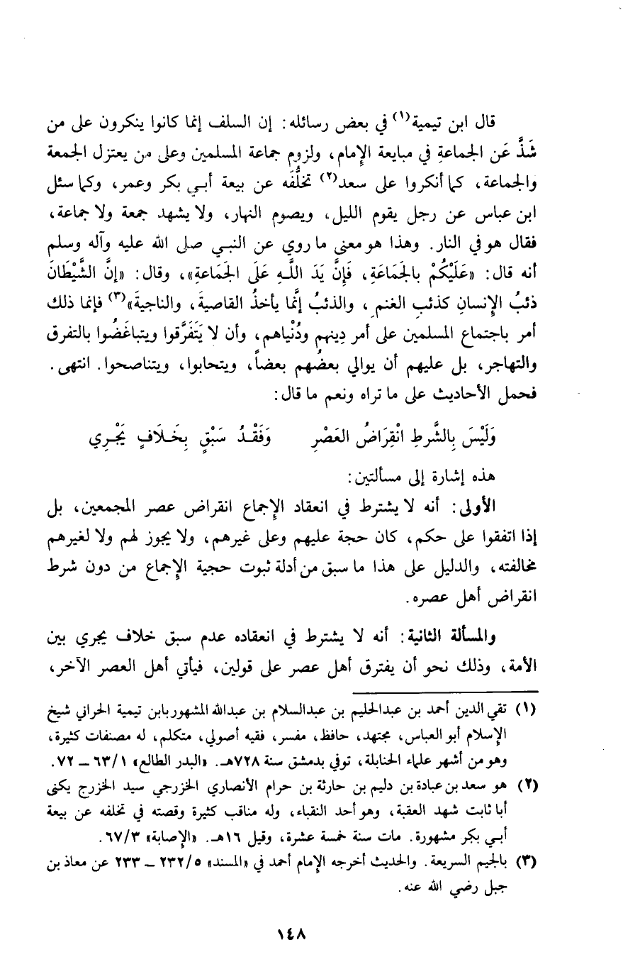 قَالَ ابْن تَيْمِية فِي بعض رسائله إِن السّلف إِنَّمَا كَانُوا يُنكرُونَ على من شَذَّ عَن الْجَمَاعَة فِي مبايعة الإِمَام وَلُزُوم جمَاعَة الْمُسلمين وعَلى من يعتزل الْجُمُعَة وَالْجَمَاعَة كَمَا أَنْكَرُوا على سعد تخلفه عَن بيعَة أبي بكر وَعمر وكما سُئِلَ ابْن عَبَّاس عَن رجل يقوم اللَّيْل ويصوم النَّهَار وَلَا يشْهد جُمُعَة وَلَا جمَاعَة فَقَالَ هُوَ فِي النَّار وَهَذَا هُوَ معنى مَا رُوِيَ عَن النَّبِي صلى الله عَلَيْهِ وَسلم أَنه قَالَ عَلَيْكُم بِالْجَمَاعَة فَإِن يَد الله على الْجَمَاعَة وَقَالَ إِن الشَّيْطَان ذِئْب الْإِنْسَان كذئب الْغنم وَالذِّئْب إِنَّمَا يَأْخُذ القاصية والناجية فَإِنَّمَا ذَلِك أَمر باجتماع الْمُسلمين على أَمر دينهم ودنياهم وَأَن لَا يتفرقوا ويتباغضوا بالتفرق والتهاجر بل عَلَيْهِم أَن يوالي بَعضهم بَعْضًا ويتحابوا ويتناصحوا انْتهى