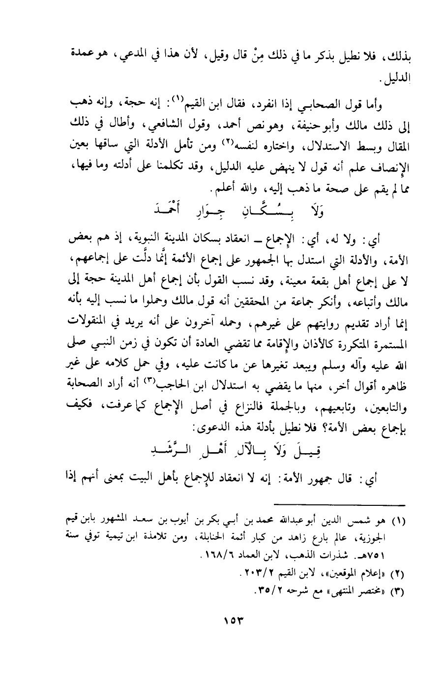 وَأما قَول الصَّحَابِيّ إِذا انْفَرد فَقَالَ ابْن الْقيم إِنَّه حجَّة وَإنَّهُ ذهب إِلَى ذَلِك مَالك وَأَبُو حنيفَة وَهُوَ نَص أَحْمد وَقَول الشَّافِعِي وَأطَال فِي ذَلِك الْمقَال وَبسط الِاسْتِدْلَال وَاخْتَارَهُ لنَفسِهِ وَمن تَأمل الْأَدِلَّة الَّتِي سَاقهَا بِعَين الْإِنْصَاف علم أَنه قَول لَا ينْهض عَلَيْهِ الدَّلِيل وَقد تكلمنا على أدلته وَمَا فِيهَا مِمَّا لَا يقم على صِحَة مَا ذهب إِلَيْهِ وَالله أعلم ... وَلَا بسكان جوَار أَحْمد ...