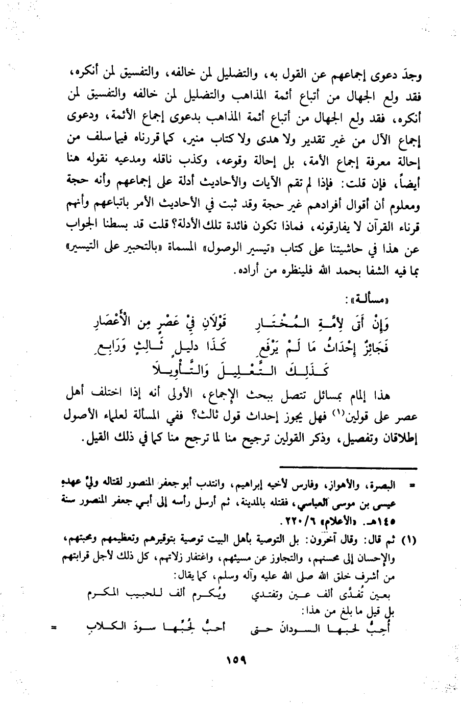 وجد دَعْوَى إِجْمَاعهم عَن القَوْل بِهِ والتضليل لمن خَالفه والتفسيق لمن أنكرهُ فقد ولع الْجُهَّال من أَتبَاع أَئِمَّة الْمذَاهب والتضليل لمن خَالفه والتفسيق لمن أنكرهُ فقد ولع الْجُهَّال من أَتبَاع أَئِمَّة الْمذَاهب بِدَعْوَى إِجْمَاع الْأَئِمَّة وَدَعوى إِجْمَاع الْآل من غير تَقْدِير وَلَا هدى وَلَا كتاب مُنِير كَمَا قَرَّرْنَاهُ فِيمَا سلف من إِحَالَة معرفَة إِجْمَاع الْأمة بل إِحَالَة وُقُوعه وَكذب ناقله ومدعيه نقُوله هُنَا أَيْضا فَإِن قلت فَإِذا لم تقم الْآيَات وَالْأَحَادِيث أَدِلَّة على إِجْمَاعهم وَأَنه حجَّة وَمَعْلُوم أَن أَقْوَال أفرادهم غير حجَّة وَقد ثَبت فِي الْأَحَادِيث الْأَمر باتبَاعهمْ وَأَنَّهُمْ قرناء الْقُرْآن لَا يفارقونه فَمَاذَا تكون فَائِدَة تِلْكَ الْأَدِلَّة قلت قد بسطنا الْجَواب عَن هَذَا فِي حاشيتنا على كتاب تيسير الْوُصُول الْمُسَمَّاة بالتحبير على التَّيْسِير بِمَا فِيهِ الشفا بِحَمْد الله فلينظره من أَرَادَهُ