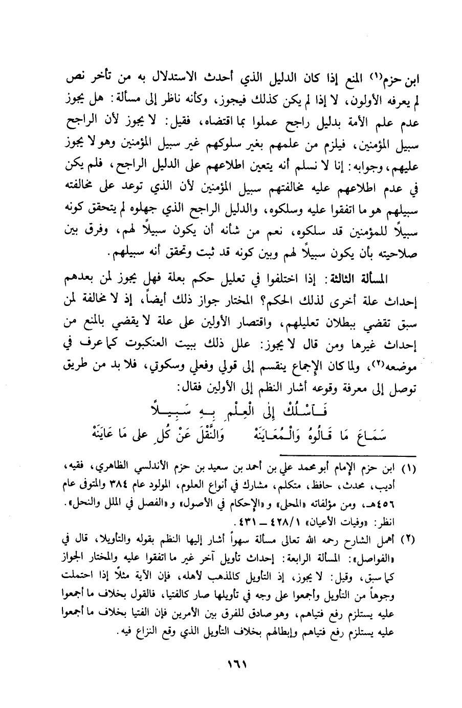 ابْن حزم الْمَنْع إِذا كَانَ الدَّلِيل الَّذِي أحدث الِاسْتِدْلَال بِهِ من تَأَخّر نَص لم يعرفهُ الْأَولونَ لَا إِذا لم يكن كَذَلِك فَيجوز وَكَأَنَّهُ نَاظر إِلَى مَسْأَلَة هَل يجوز عدم علم الْأمة بِدَلِيل رَاجِح عمِلُوا بِمَا اقْتَضَاهُ فَقيل لَا يجوز لِأَن الرَّاجِح سَبِيل الْمُؤمنِينَ فَيلْزم من عَمَلهم بِغَيْر سلوكهم غير سَبِيل الْمُؤمنِينَ وَهُوَ لَا يجوز عَلَيْهِم وَجَوَابه إِنَّا لَا نسلم أَنه يتَعَيَّن إطلاعهم على الدَّلِيل الرَّاجِح فَلم يكن فِي عدم اطلاعهم عَلَيْهِ مخالفتهم سَبِيل الْمُؤمنِينَ لِأَن الَّذِي توعد على مُخَالفَته سبيلهم هُوَ مَا اتَّفقُوا عَلَيْهِ وسلكوه وَالدَّلِيل الرَّاجِح الَّذِي جهلوه لم يتَحَقَّق كَونه سَبِيلا للْمُؤْمِنين قد سلكوه نعم من شَأْنه أَن يكون سَبِيلا لَهُم وَفرق بَين صلاحيته بِأَن يكون سَبِيلا لَهُم وَبَين كَونه قد ثَبت وَتحقّق أَنه سبيلهم