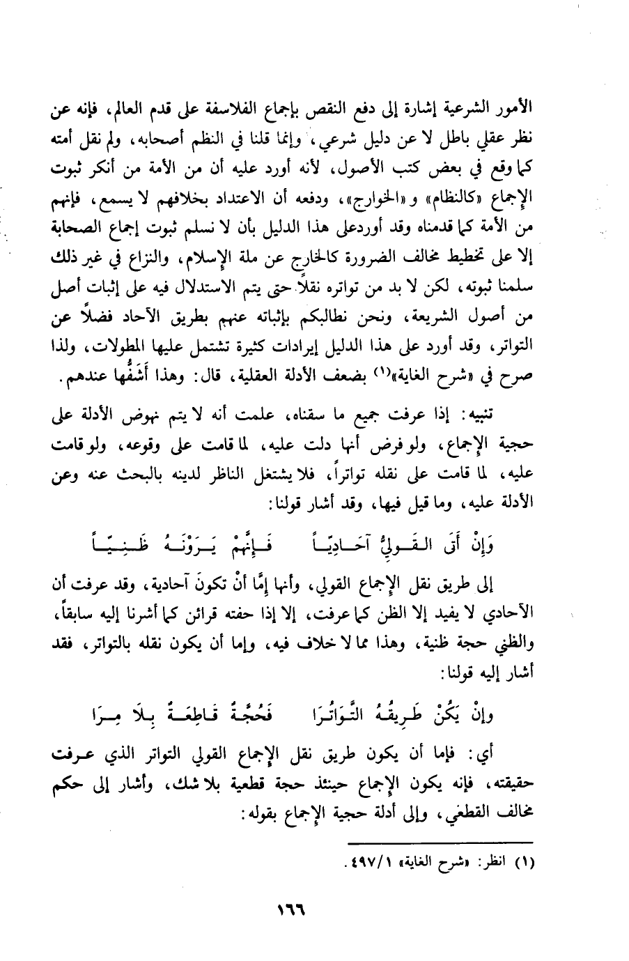 إِلَى طَرِيق نقل الْإِجْمَاع القولي وَأَنَّهَا إِمَّا أَن تكون آحادية وَقد عرفت أَن الآحادي لَا يُفِيد إِلَّا الظَّن كَمَا عرفت إِلَّا إِذا حَفَّتْهُ قَرَائِن كَمَا أَشَرنَا إِلَيْهِ سَابِقًا والظني حجَّة ظنية وَهَذَا مِمَّا لَا خلاف فِيهِ وَإِمَّا أَن يكون نَقله بالتواتر فقد أَشَارَ إِلَيْهِ قَوْلنَا ... وَإِن يكن طَرِيقه التواترا ... فحجة قَاطِعَة بِلَا مرا ...