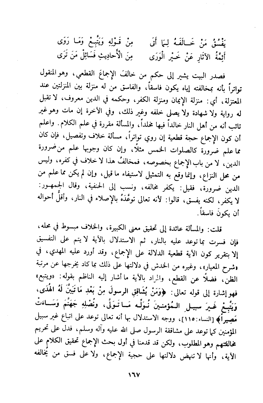 قلت وَالْمَسْأَلَة عَائِدَة إِلَى تَحْقِيق معنى الْكَبِيرَة وَالْخلاف مَبْسُوط فِي مَحَله فَإِن فسرت بِمَا توعد عَلَيْهِ بالنَّار ثمَّ الِاسْتِدْلَال بِالْآيَةِ لَا يتم على التفسيق إِلَّا بتقرير كَون الْآيَة قَطْعِيَّة الدّلَالَة على الْإِجْمَاع وَقد أورد عَلَيْهِ الْمهْدي فِي شرح المعيار وَغَيره من الخدش فِي دلالتها على ذَلِك بِمَا كَاد يُخرجهَا عَن مرتبَة الظَّن فضلا عَن الْقطع وَالْمرَاد بِالْآيَةِ مَا أَشَارَ إِلَيْهِ النَّاظِم بقوله وَيتبع فَهُوَ إِشَارَة إِلَى قَوْله تَعَالَى {وَمن يُشَاقق الرَّسُول من بعد مَا تبين لَهُ الْهدى وَيتبع غير سَبِيل الْمُؤمنِينَ نوله مَا تولى ونصله جَهَنَّم وَسَاءَتْ مصيرا} وَوجه الِاسْتِدْلَال بهَا أَنه تَعَالَى توعد على اتِّبَاع غير سَبِيل الْمُؤمنِينَ كَمَا توعد مشاققة الرَّسُول صلى الله عَلَيْهِ وَسلم فَدلَّ على تَحْرِيم مخالفتهم وَهُوَ الْمَطْلُوب وَلَكِن قد قدمنَا فِي أول بحث الْإِجْمَاع تَحْقِيق الْكَلَام على الْآيَة وَأَنَّهَا لَا تنهض دلالتها على حجَّة الْإِجْمَاع وَلَا على فسق من يُخَالِفهُ