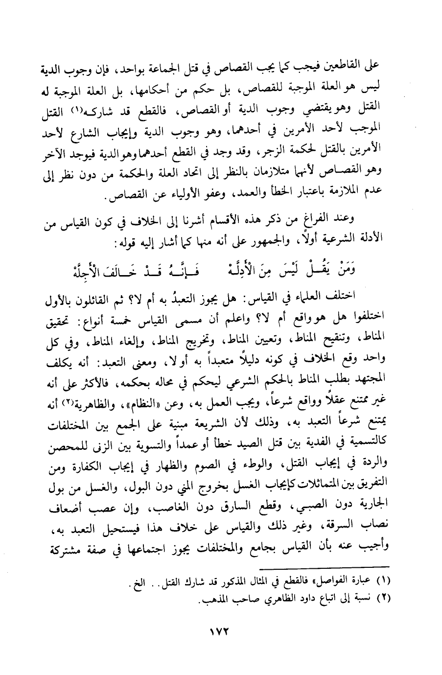اخْتلف الْعلمَاء فِي الْقيَاس هَل يجوز التَّعَبُّد بِهِ أم لَا ثمَّ الْقَائِلُونَ بِالْأولِ اخْتلفُوا هَل هُوَ وَاقع أم لَا وَاعْلَم أَن مُسَمّى الْقيَاس خَمْسَة أَنْوَاع تَحْقِيق المناط وتنقيح المناط وَتَعْيِين المناط وَتَخْرِيج المناط وإلغاء المناط وَفِي كل وَاحِد وَقع الْخلاف فِي كَونه دَلِيلا متعبدا بِهِ أَو لَا وَمعنى التَّعَبُّد أَنه يُكَلف الْمُجْتَهد بِطَلَب المناط بالحكم الشَّرْعِيّ ليحكم فِي محاله بِحكمِهِ فالأكثر على أَنه غير مُمْتَنع عقلا وواقع شرعا وَيجب الْعَمَل بِهِ وَعَن النظام والظاهرية أَنه يمْتَنع شرعا التَّعَبُّد بِهِ وَذَلِكَ لِأَن الشَّرِيعَة مَبْنِيَّة على الْجَمِيع بَين المختلفات كالتسمية فِي الْفِدْيَة بَين قتل الصَّيْد خطأ أَو عمدا والتسوية بَين الزِّنَى للمحصن وَالرِّدَّة فِي إِيجَاب الْقَتْل وَالْوَطْء فِي الصَّوْم وَالظِّهَار فِي إِيجَاب الْكَفَّارَة وَمن التَّفْرِيق بَين المتماثلات كإيجاب الْغسْل بِخُرُوج الْمَنِيّ دون الْبَوْل وَالْغسْل من بَوْل الْجَارِيَة دون الصَّبِي وَقطع السَّارِق دون الْغَاصِب وَإِن عصب أَضْعَاف نِصَاب السّرقَة وَغير ذَلِك وَالْقِيَاس على خلاف هَذَا فيستحيل التَّعَبُّد بِهِ وَأجِيب عَنهُ بِأَن الْقيَاس بِجَامِع والمختلفات يجوز اجتماعها فِي صفة مُشْتَركَة