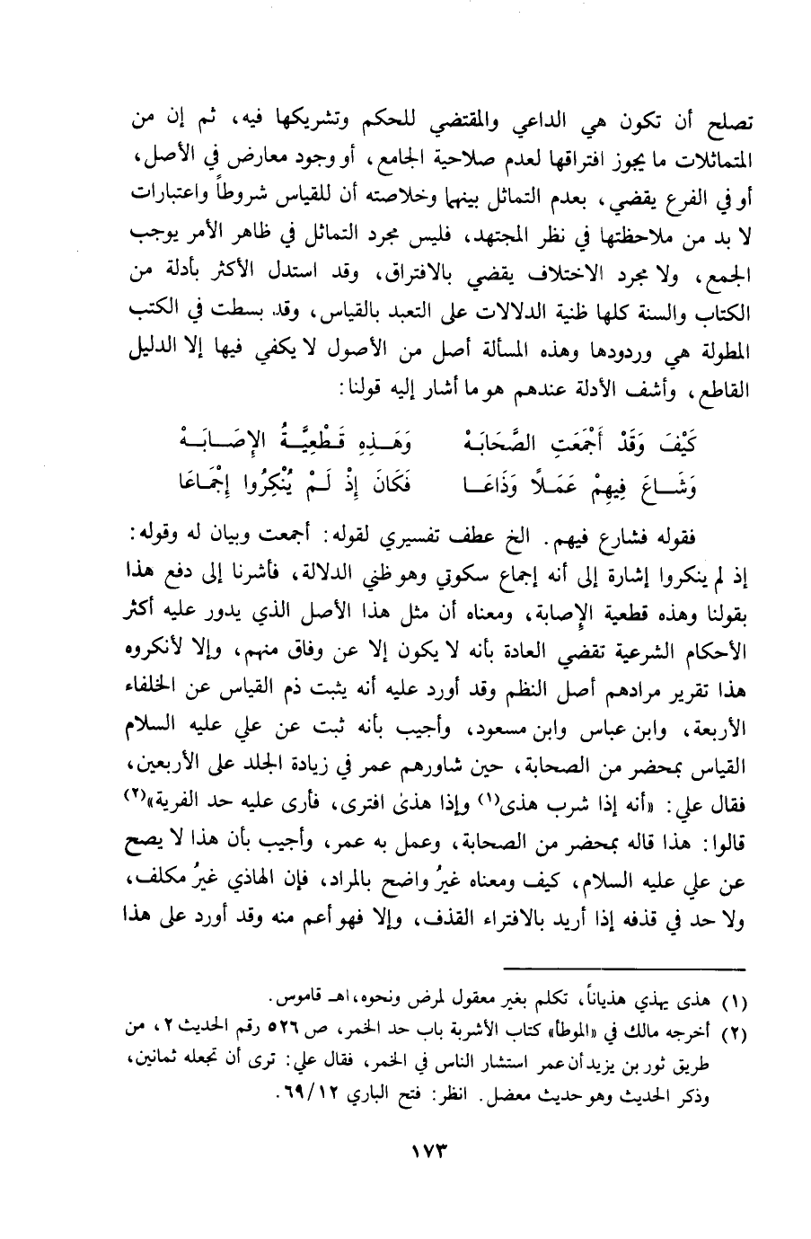 فَقَوله فشارع فيهم الخ عطف تفسيري لقَوْله أَجمعت وَبَيَان لَهُ وَقَوله إِذْ لم ينكروا إِشَارَة إِلَى أَنه إِجْمَاع سكوتي وَهُوَ ظَنِّي الدّلَالَة فأشرنا إِلَى دفع هَذَا بقولنَا وَهَذِه قَطْعِيَّة الْإِصَابَة وَمَعْنَاهُ أَن مثل هَذَا الأَصْل الَّذِي يَدُور عَلَيْهِ أَكثر الْأَحْكَام الشَّرْعِيَّة تقضي الْعَادة بِأَنَّهُ لَا يكون إِلَّا عَن وفَاق مِنْهُم وَإِلَّا لأنكروه هَذَا تَقْرِير مُرَادهم أصل النّظم وَقد أورد عَلَيْهِ أَنه يثبت ذمّ الْقيَاس عَن الْخُلَفَاء الْأَرْبَعَة وَابْن عَبَّاس وَابْن مَسْعُود وَأجِيب بِأَنَّهُ ثَبت عَن عَليّ عَلَيْهِ السَّلَام الْقيَاس بِمحضر من الصَّحَابَة حِين شاورهم عمر فِي زِيَادَة الْجلد على الْأَرْبَعين فَقَالَ عَليّ أَنه إِذا شرب هذى وَإِذا هذى افترى فَأرى عَلَيْهِ حد الْفِرْيَة قَالُوا هَذَا قَالَه بِمحضر من الصَّحَابَة وَعمل بِهِ عمر وَأجِيب بِأَن هَذَا لَا يَصح عَن عَليّ عَلَيْهِ السَّلَام كَيفَ وَمَعْنَاهُ غير وَاضح بالمراد فَإِن الهاذي غير مُكَلّف وَلَا حد فِي قذفه إِذا أُرِيد بالافتراء الْقَذْف وَإِلَّا فَهُوَ أَعم مِنْهُ وَقد أورد على هَذَا