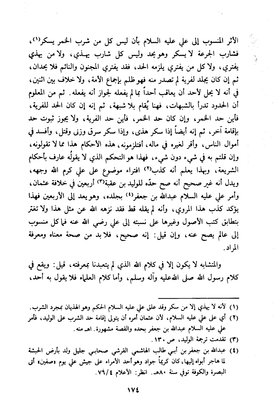 الْأَثر الْمَنْسُوب إِلَى عَليّ عَلَيْهِ السَّلَام بِأَن لَيْسَ كل من شرب الْخمر يسكر فشارب الجرعة لَا يسكر وَهُوَ يحد وَلَيْسَ كل شَارِب يهذي وَلَا من يهذي يفتري وَلَا كل من يفتري يلْزمه الْحَد فقد يفتري الْمَجْنُون والنائم فَلَا يحدان ثمَّ إِن كَانَ يجلد لفرية لم تصدر مِنْهُ فَهُوَ ظلم بِإِجْمَاع الْأمة وَلَا خلاف بَين اثْنَيْنِ فِي أَنه لَا يحل لأحد أَن يُعَاقب أحدا بِمَا لم يَفْعَله لجَوَاز أَنه يَفْعَله ثمَّ من الْمَعْلُوم أَن الْحُدُود تدرأ بِالشُّبُهَاتِ فَهُنَا يُقَام بِلَا شُبْهَة ثمَّ إِنَّه إِن كَانَ الْحَد للفرية فَأَيْنَ حد الْخمر وَإِن كَانَ حد الْخمر فَأَيْنَ حد الْفِرْيَة وَلَا يجوز ثُبُوت حد بِإِقَامَة آخر ثمَّ إِنَّه أَيْضا إِذا سكر هذى وَإِذا سكر سرق وزنى وَقتل وأفسد فِي أَمْوَال النَّاس وَأقر لغيره فِي مَاله أفتلزمونه هَذِه الْأَحْكَام هَذَا مِمَّا لَا تقولونه وَإِن قُلْتُمْ بِهِ فِي شَيْء دون شيىء فَهَذَا هُوَ التحكم الَّذِي لَا يَقُوله عَارِف بِأَحْكَام الشَّرِيعَة وَبِهَذَا يعلم أَنه كذب افتراء مَوْضُوع على عَليّ كرم الله وَجهه وَيدل أَنه غير صَحِيح أَنه صَحَّ حَده للوليد بن عقبَة أَرْبَعِينَ فِي خلَافَة عُثْمَان وَأمر عَليّ عَلَيْهِ السَّلَام عبد الله بن جَعْفَر بجلده وَهُوَ يعد إِلَى الْأَرْبَعين فَهَذَا يُؤَكد كذب هَذَا الْمَرْوِيّ وَأَنه لم يقلهُ قطّ فقد نزهه الله عَن مثل هَذَا وَلَا تغتر بتطابق كتب الْأُصُول وَغَيرهَا على نسبته إِلَى عَليّ رَضِي الله عَنهُ فَمَا كل مَنْسُوب إِلَى عَالم يَصح عَنهُ وَإِن قيل إِنَّه صَحِيح فَلَا بُد من صِحَة مَعْنَاهُ وَمَعْرِفَة المُرَاد