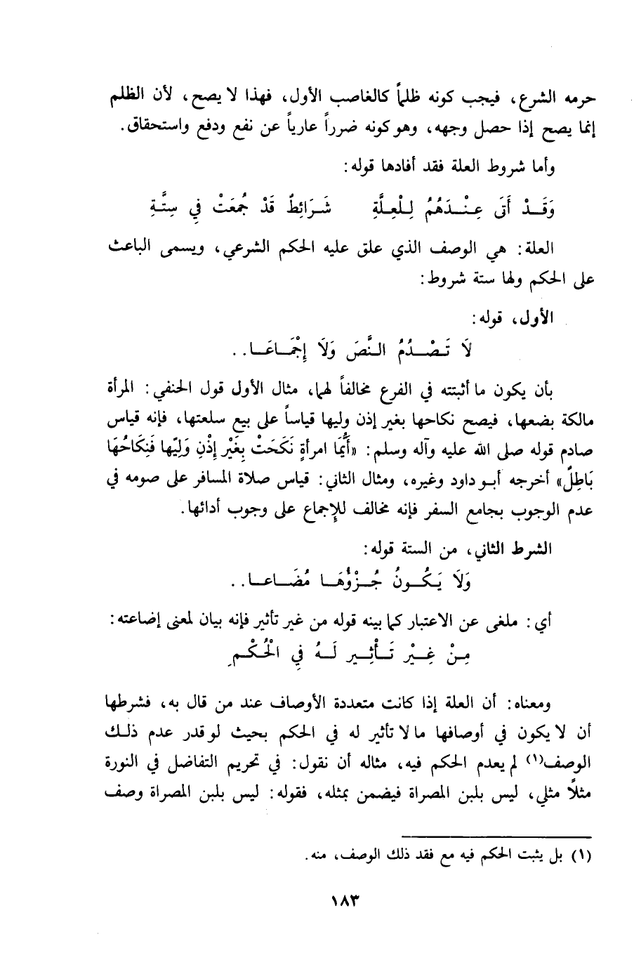 وَأما شُرُوط الْعلَّة فقد أفادها قَوْله ... وَقد أَتَى عِنْدهم لِلْعِلَّةِ ... شَرَائِط قد جمعت فِي سِتَّة ...