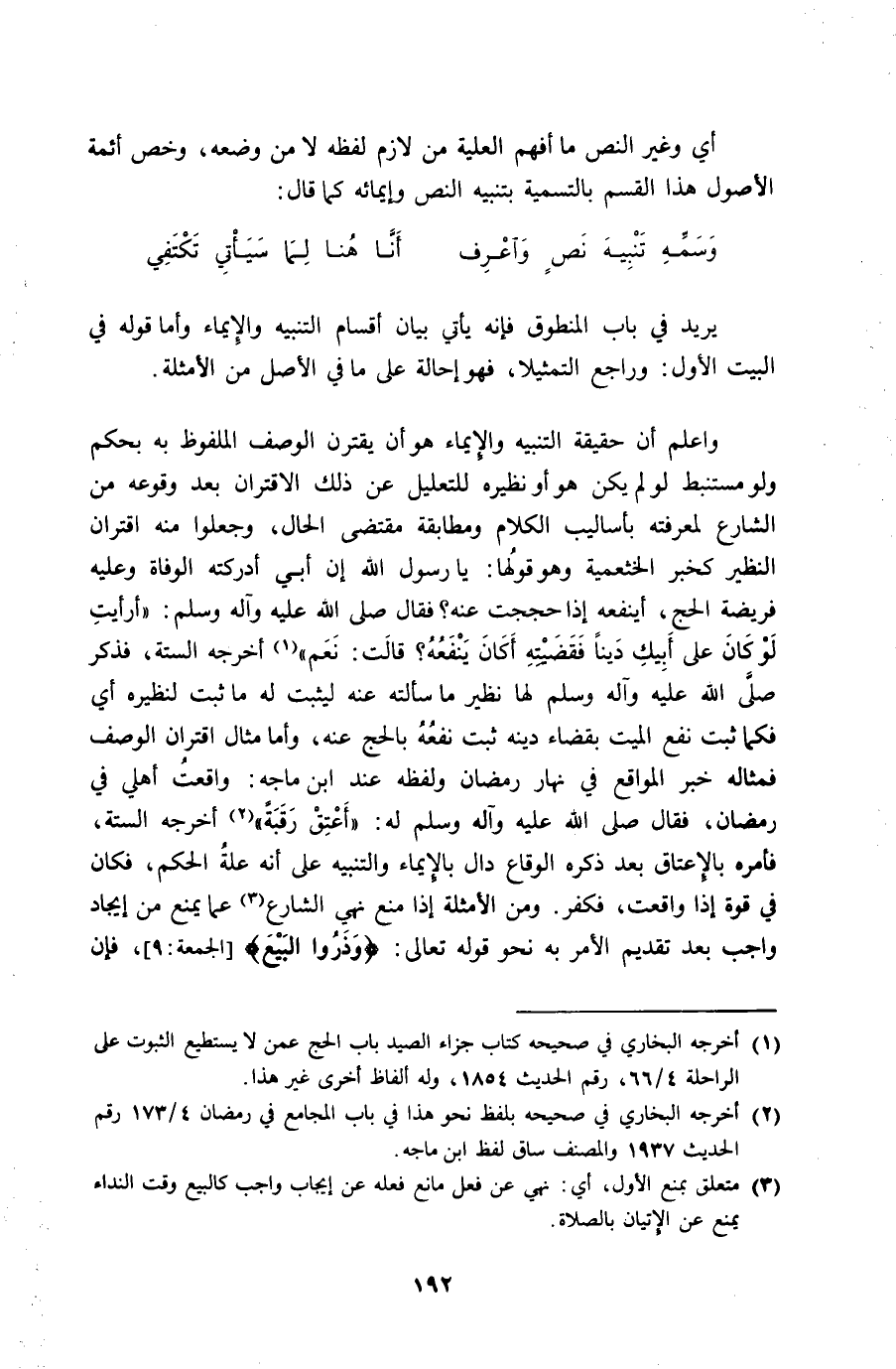 وَاعْلَم ان حَقِيقَة التَّنْبِيه والإيماء هُوَ أَن يقْتَرن الْوَصْف الملفوظ بِهِ بِحكم وَلَو مستنبط لَو لم يكن هُوَ أَو نَظِيره للتَّعْلِيل عَن ذَلِك الاقتران بعد وُقُوعه من الشَّارِع لمعرفته بأساليب الْكَلَام ومطابقة مُقْتَضى الْحَال وَجعلُوا مِنْهُ اقتران النظير كَخَبَر الخثعمية وَهُوَ قَوْلهَا يَا رَسُول الله إِن أبي أَدْرَكته الْوَفَاة وَعَلِيهِ فَرِيضَة الْحَج أينفعه إِذا حججْت عَنهُ فَقَالَ صلى الله عَلَيْهِ وَسلم أَرَأَيْت لَو كَانَ على أَبِيك دينا فقضيته أَكَانَ يَنْفَعهُ قَالَت نعم أخرجه السِّتَّة فَذكر صلى الله عَلَيْهِ وَسلم لَهَا نظيرا مَا سَأَلته عَنهُ ليثبت لَهُ مَا ثَبت لنظيره أَي فَكَمَا ثَبت نفع الْمَيِّت بِقَضَاء دينه ثَبت نَفعه بِالْحَجِّ عَنهُ وَأما مِثَال اقتران الْوَصْف فمثاله خبر المواقع فِي نَهَار رَمَضَان وَلَفظه عِنْد ابْن مَاجَه واقعت أَهلِي فِي رَمَضَان فَقَالَ صلى الله عَلَيْهِ وَسلم فَقَالَ صلى الله عَلَيْهِ وَسلم لَهُ أعتق رَقَبَة أخرجه السِّتَّة فَأمره بِالْإِعْتَاقِ بعد ذكره الوقاع دَال بِالْإِيمَاءِ والتنبيه على أَنه عِلّة الحكم فَكَانَ فِي قُوَّة إِذا واقعت فَكفر وَمن الْأَمْثِلَة إِذا منع نهي الشَّارِع عَمَّا يمْنَع من إِيجَاد وَاجِب بعد تَقْدِيم الْأَمر بِهِ نَحْو قَوْله تَعَالَى {وذروا البيع} فَإِن