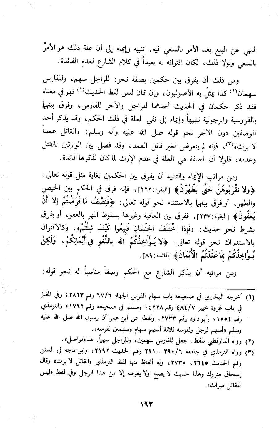 وَمن ذَلِك أَن يفرق بَين حكمين بِصفة نَحْو للراجل سهم وللفارس سَهْمَان كَذَا يمثل بِهِ الأصوليون وَإِن كَانَ لَيْسَ لفظ الحَدِيث فَهُوَ فِي مَعْنَاهُ فقد ذكر حكمان فِي الحَدِيث أَحدهمَا للراجل وَالْآخر للفارس وَفرق بَينهمَا بالفروسبة والرجولية تَنْبِيها وإيماء إِلَى نفي الْعلَّة فِي ذَلِك الحكم وَقد يذكر أحد الوصفين دون الآخر نَحْو قَوْله صلى الله عَلَيْهِ وَسلم الْقَاتِل عمدا لَا يَرث فَإِنَّهُ لم يتَعَرَّض لغير قَاتل الْعمد وَقد فصل بَين الْوَارِثين بِالْقَتْلِ وَعَدَمه فلولا أَن الصّفة هِيَ الْعلَّة فِي عدم الْإِرْث لما كَانَ لذكرها فَائِدَة