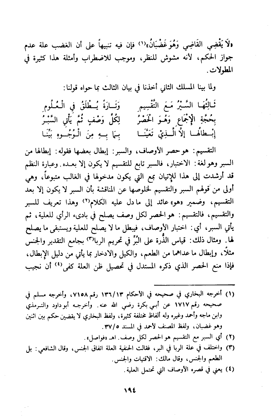 لَا يقْضِي القَاضِي وَهُوَ غَضْبَان فَإِنَّهُ فِيهِ تَنْبِيها على أَن الْغَضَب عِلّة عدم جَوَاز الحكم لِأَنَّهُ مشوش للنَّظَر وَمُوجب للاضطراب وأمثلة هَذَا كَثِيرَة فِي المطولات